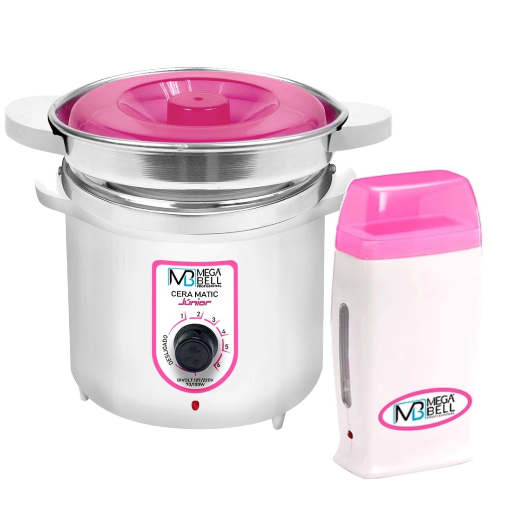 Kit Depilação Termocera 400gr Com Refil Branca Com Rosa + Aquecedor de Cera Roll-on Rosa Mega Bell