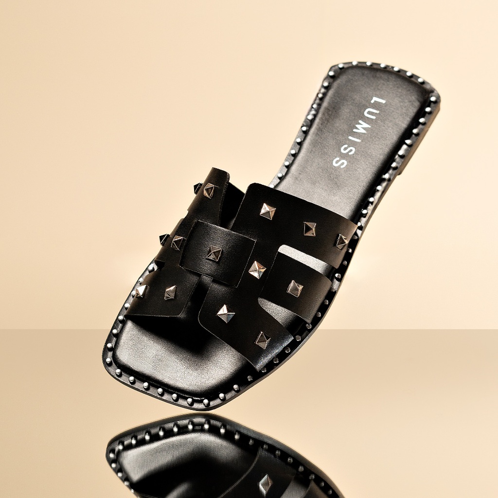 Sandália Rasteira Feminina Lumiss Tachas Spike Pirâmide Bico Quadrado Confortável Blogueira