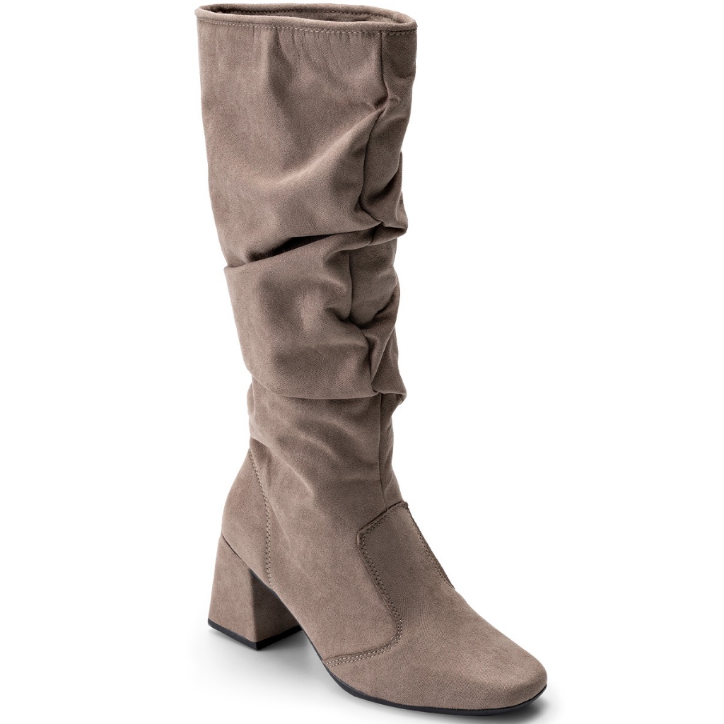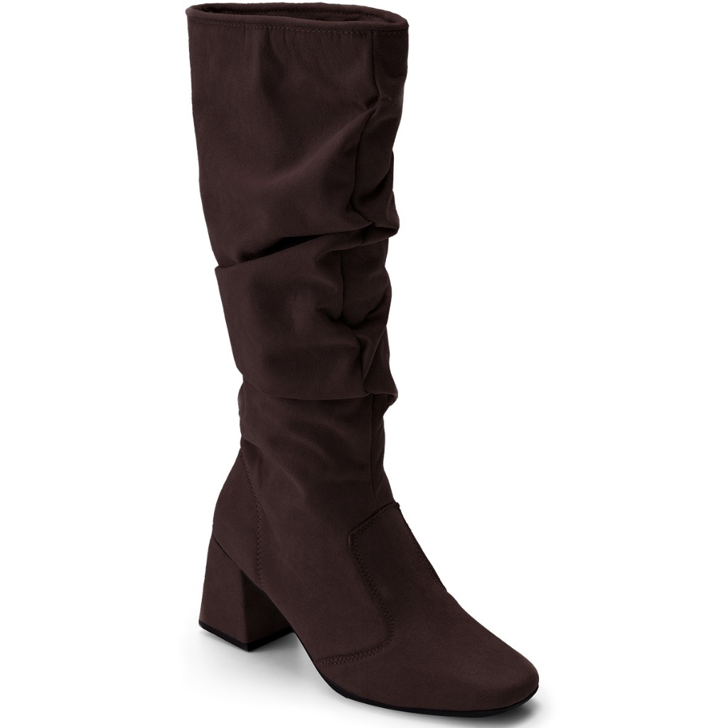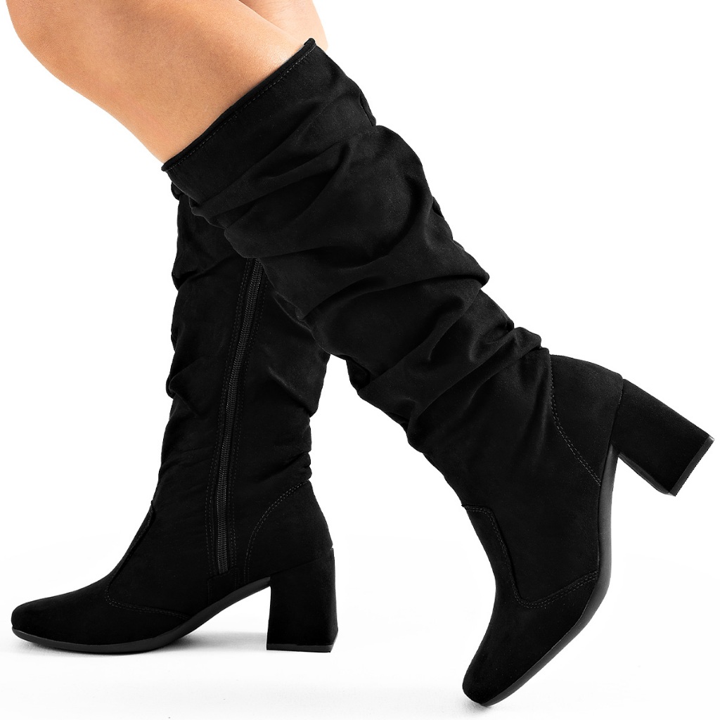 Bota Feminina Lumiss Camurça Suede Cano Alto Enrugado Salto Bloco Baixo Slouchy