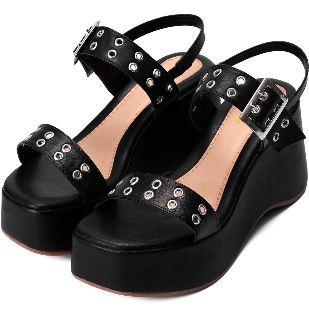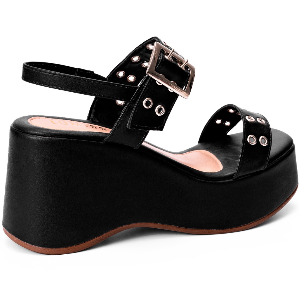 Sandália Feminina Lumiss Fivela Ilhós Anabela Plataforma Confortável Preto