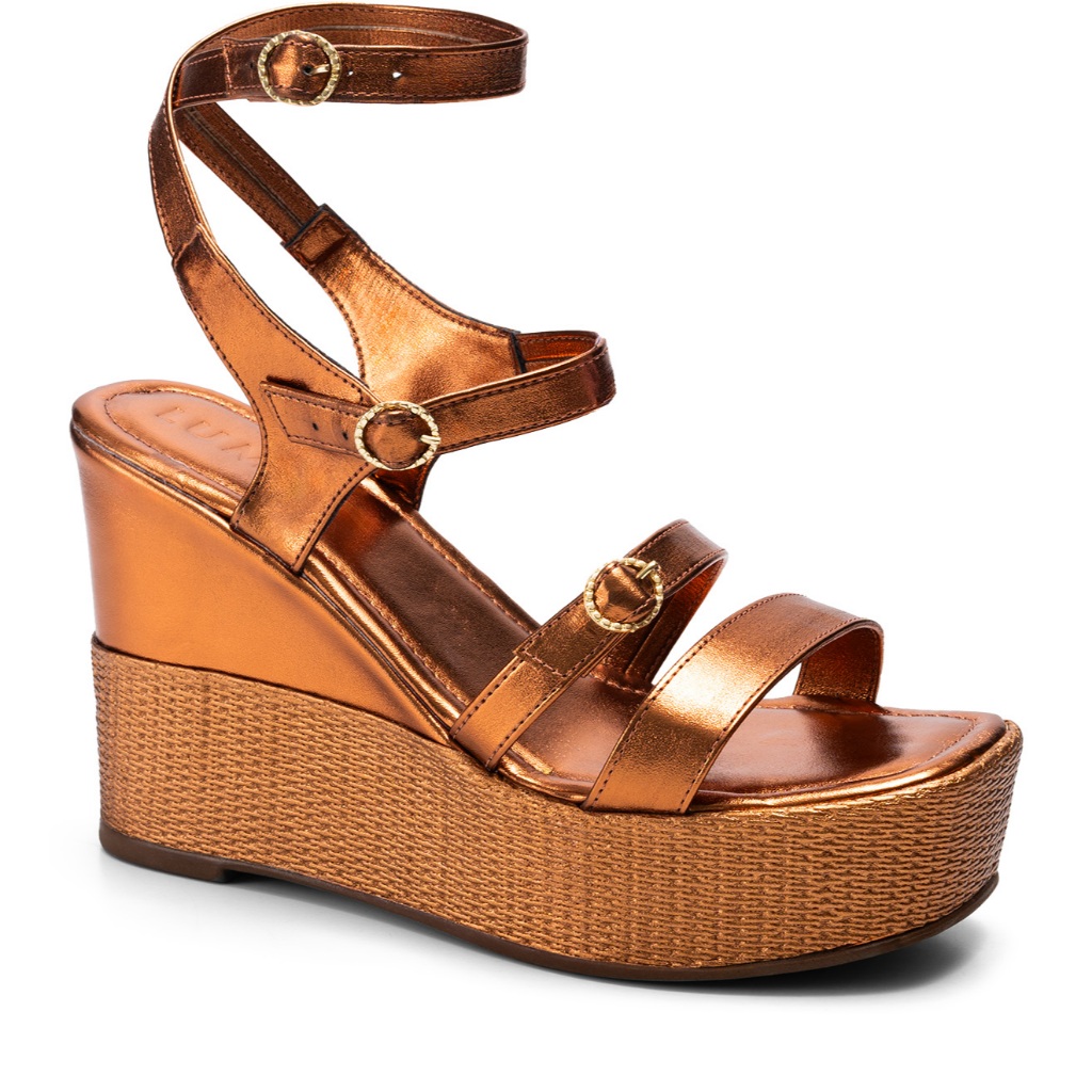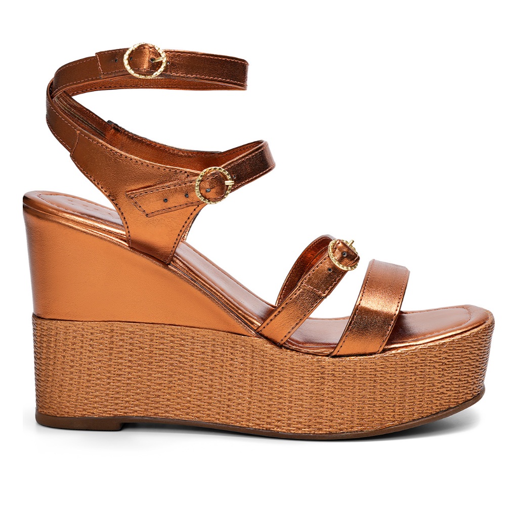 Sandália Feminina Lumiss Juta Fivelas Anabela Plataforma Confortável Alta Metalizado Bronze