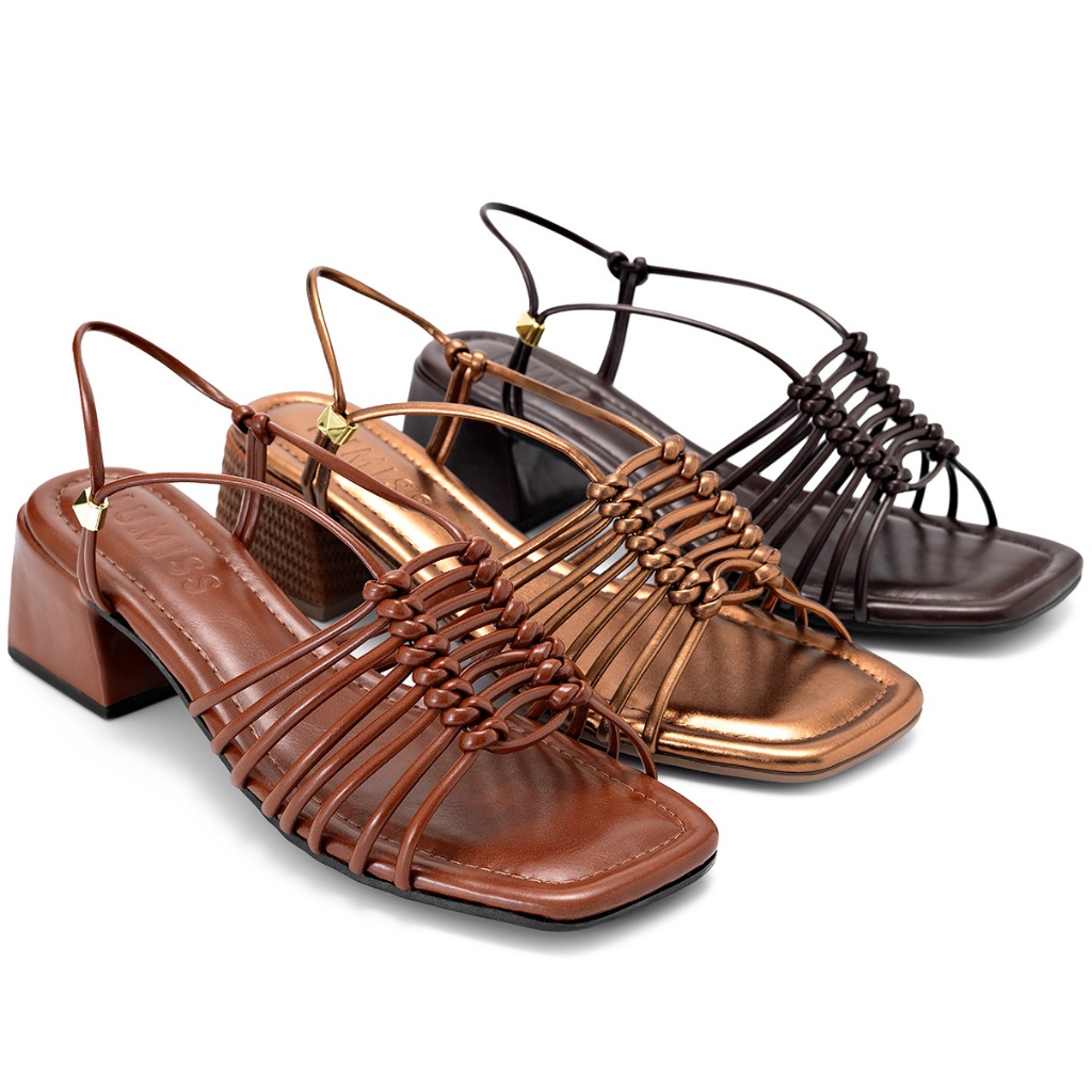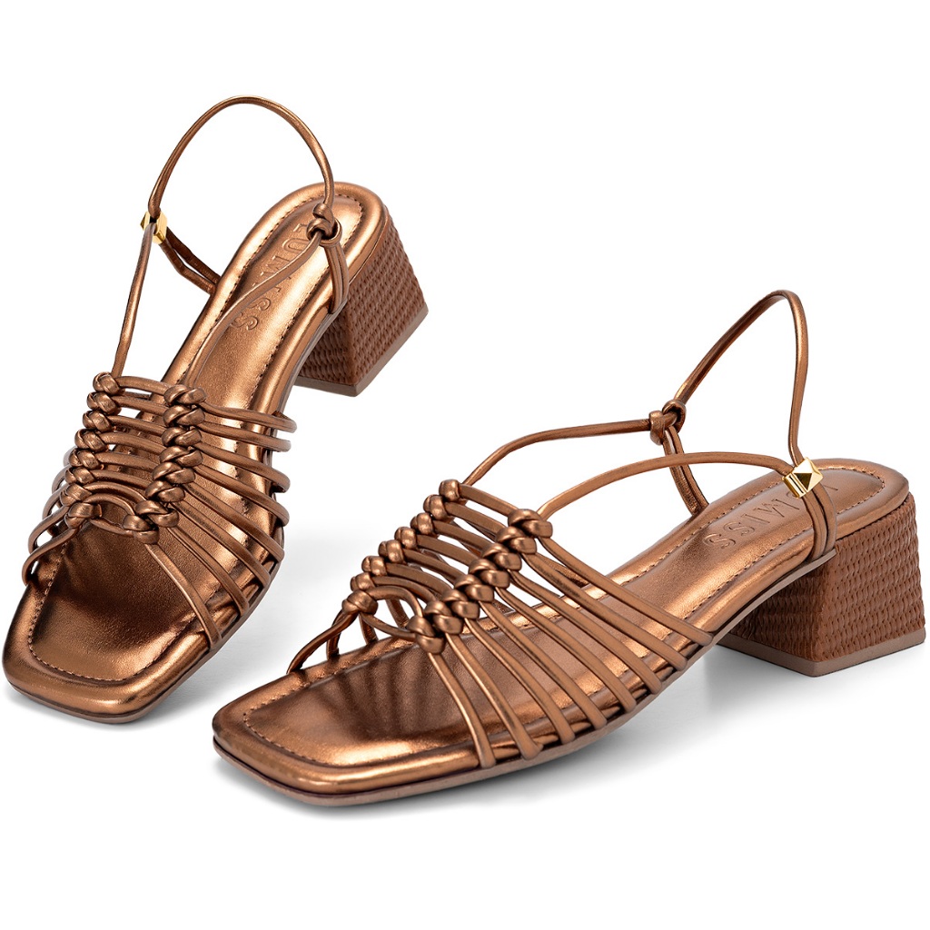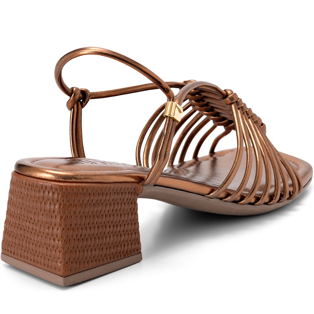 Sandália Feminina Lumiss Bico Quadrado Tramado Salto Bloco Baixo Metalizado Confortável Bronze