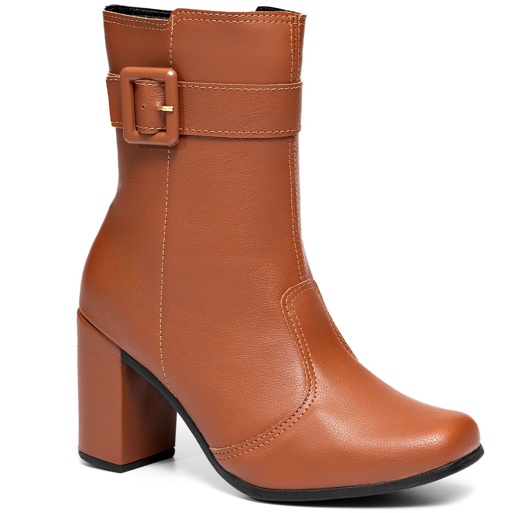 Bota Feminina Lumiss Confortável Cano Médio Bico Quadrado Salto Alto Bloco Fivela Blogueira Caramelo
