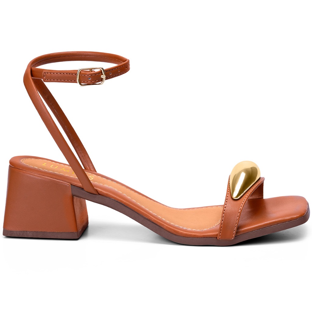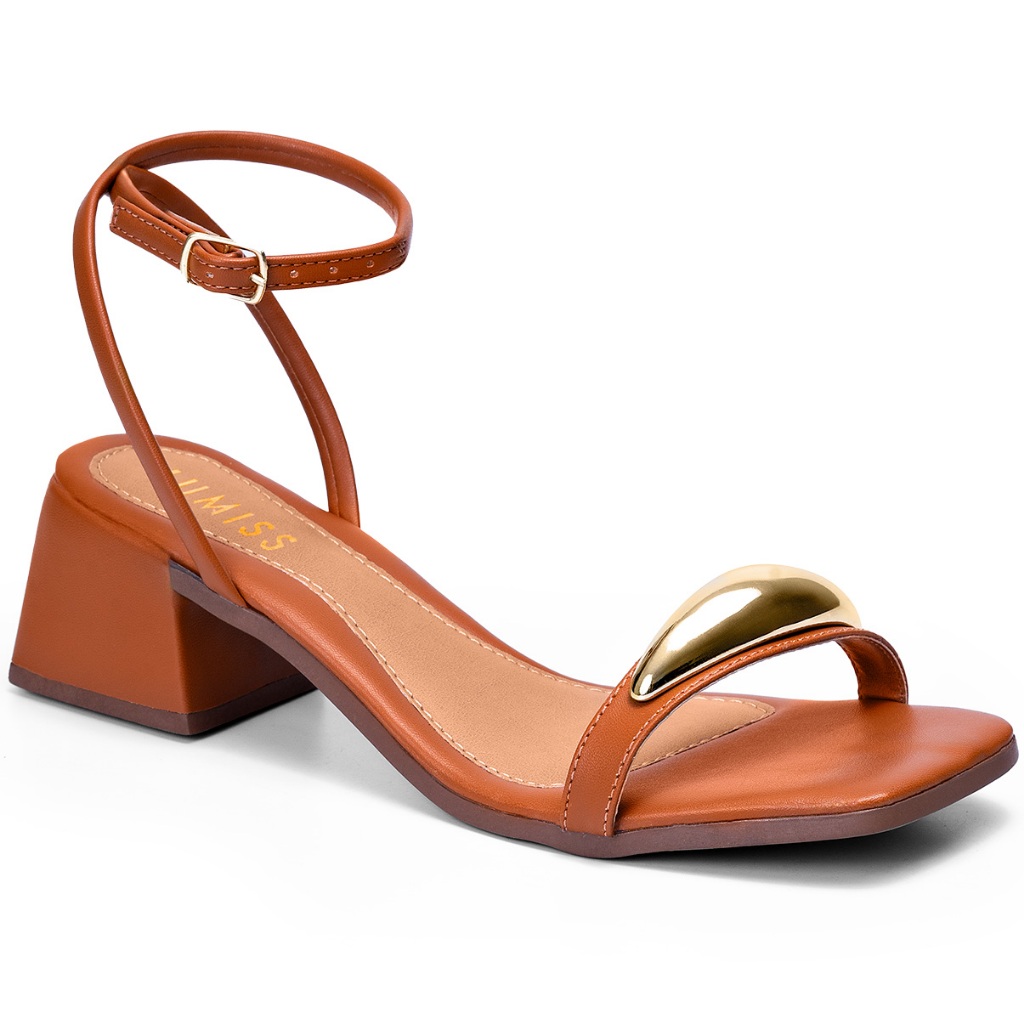 Sandália Feminina Lumiss Confortável Enfeite Metalizado Salto Baixo Bloco Caramelo