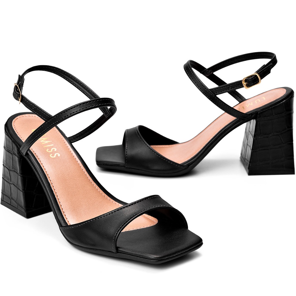 Sandália Feminina Lumiss Bico Quadrado Croco Fivela Salto Alto Grosso Preto