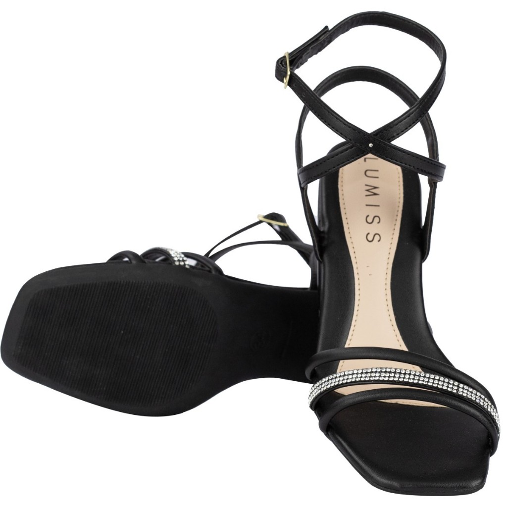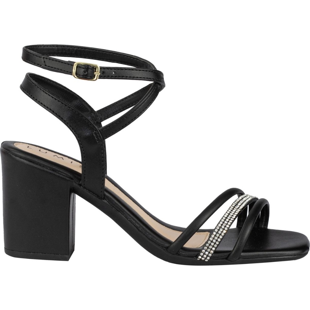 Sandália Feminina Lumiss Salto Grosso Médio Confortável Tiras Strass Brilho Preto