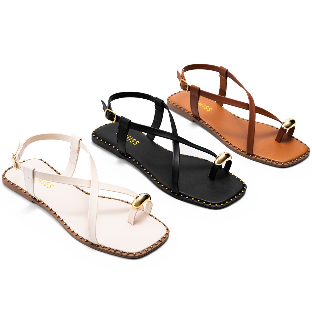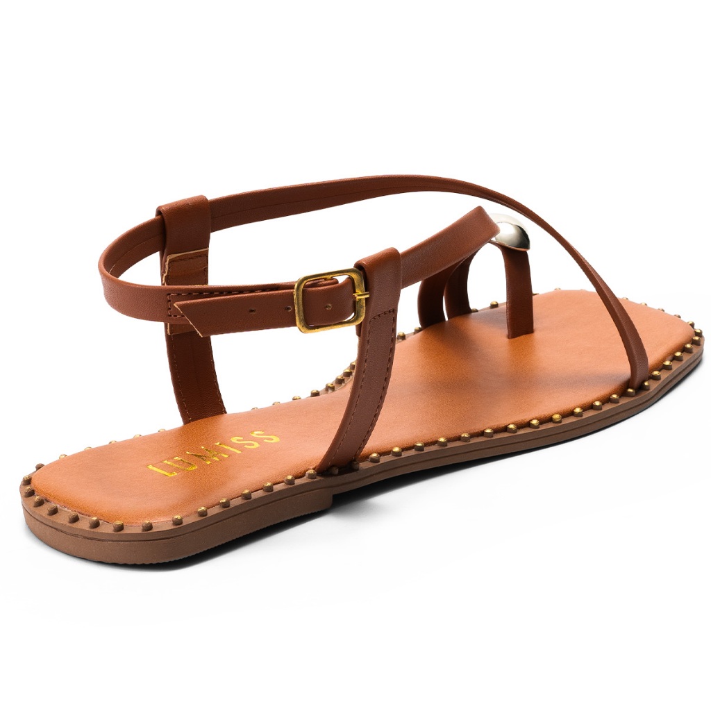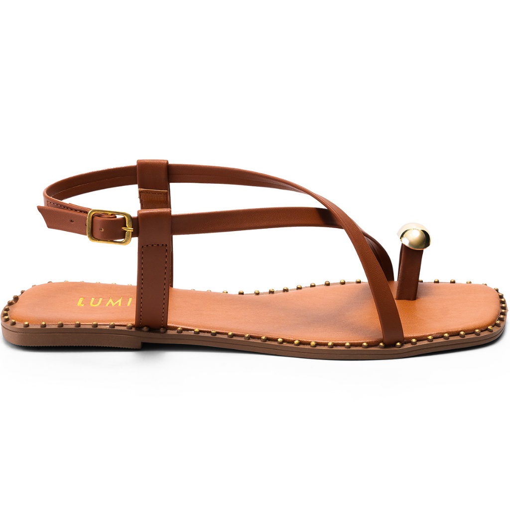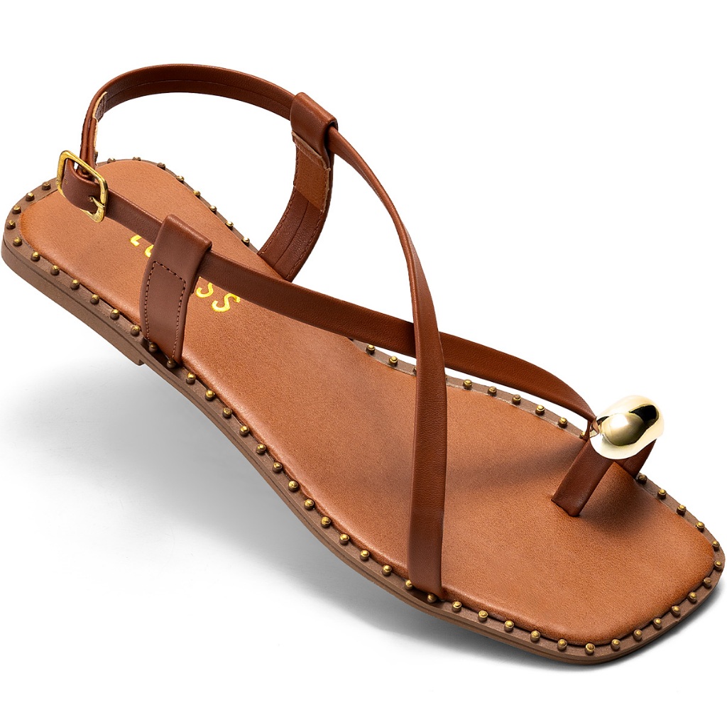 Sandália Feminina Lumiss Rasteira Bico Quadrado Tira Enfeite Metalizado Caramelo