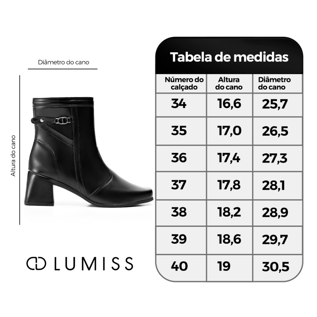 Bota Feminina Lumiss Detalhe Metal Cano Curto Salto Bloco Baixo Preto