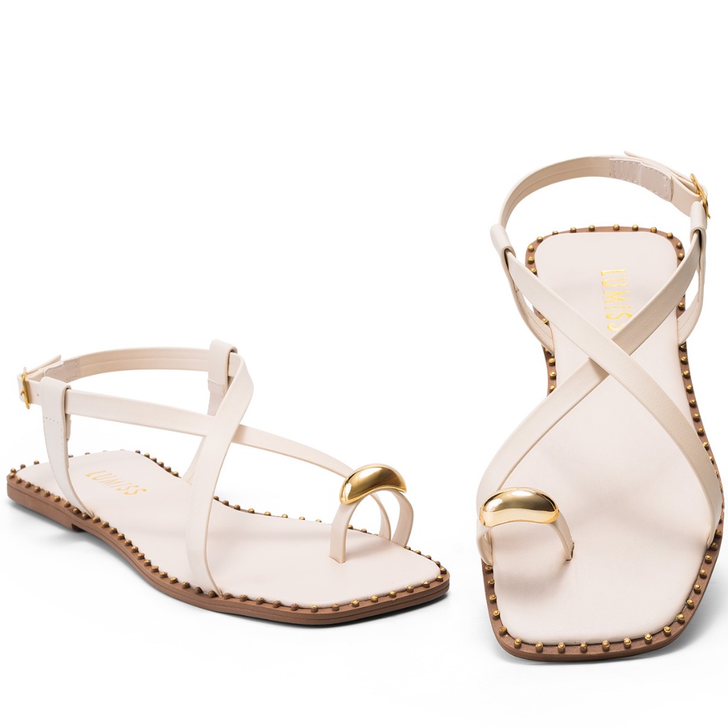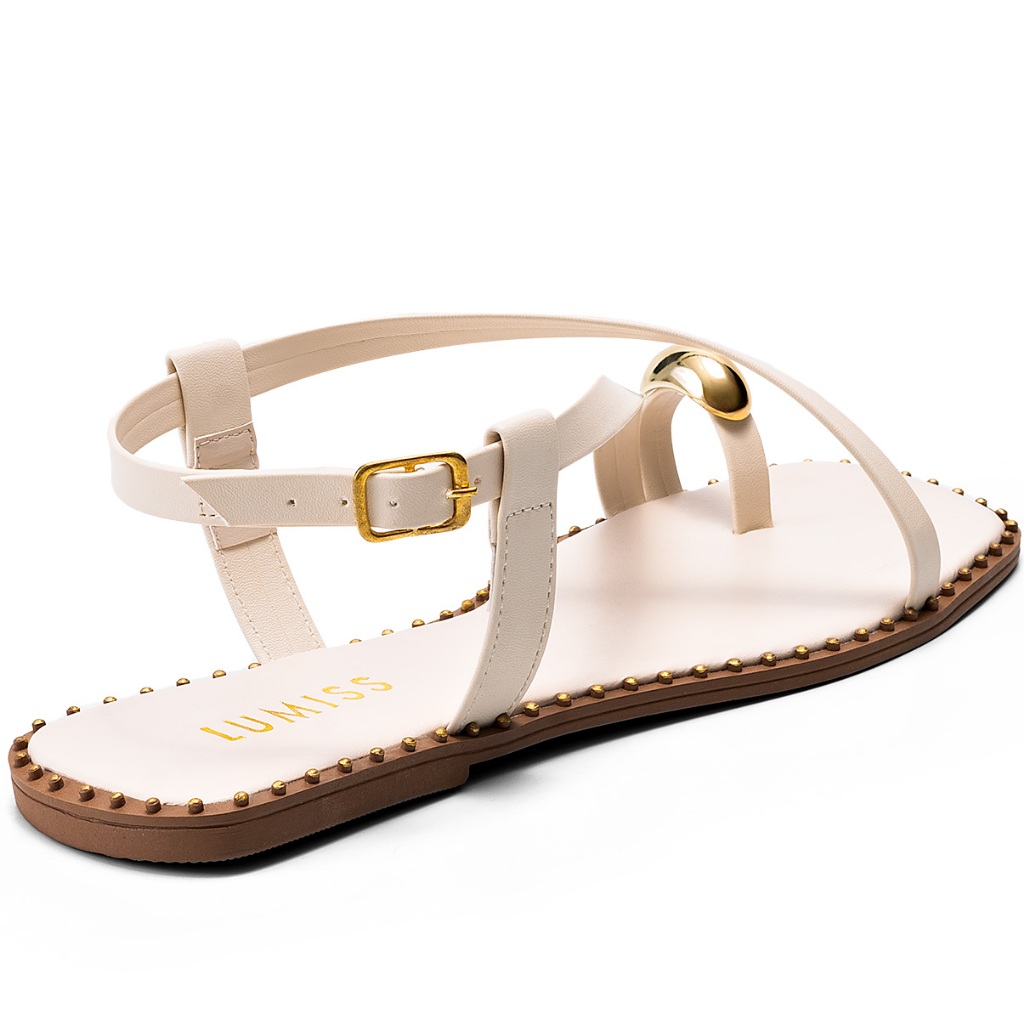 Sandália Feminina Lumiss Rasteira Bico Quadrado Tira Enfeite Metalizado Off White