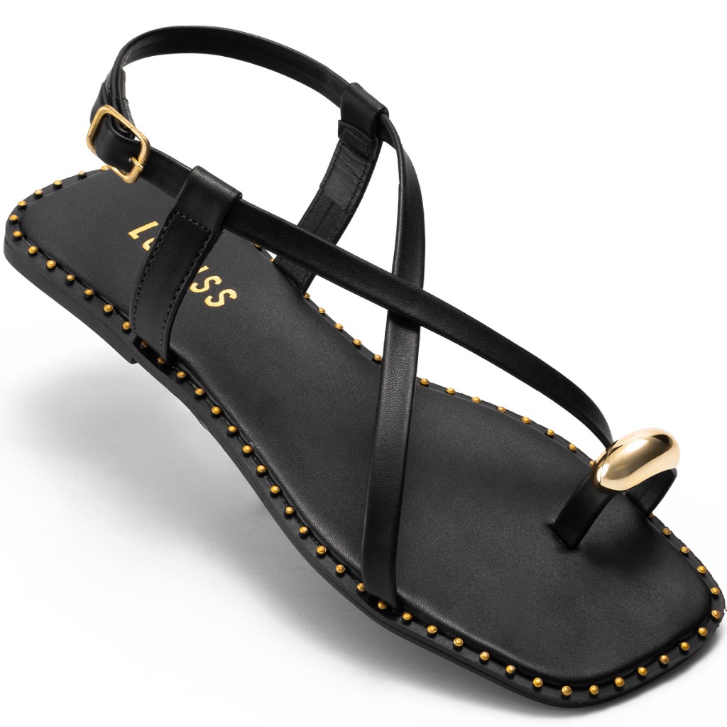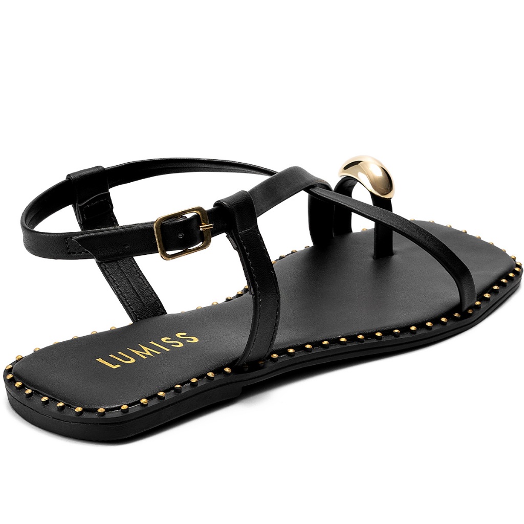 Sandália Feminina Lumiss Rasteira Bico Quadrado Tira Enfeite Metalizado Preto