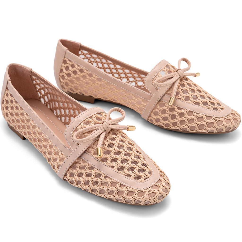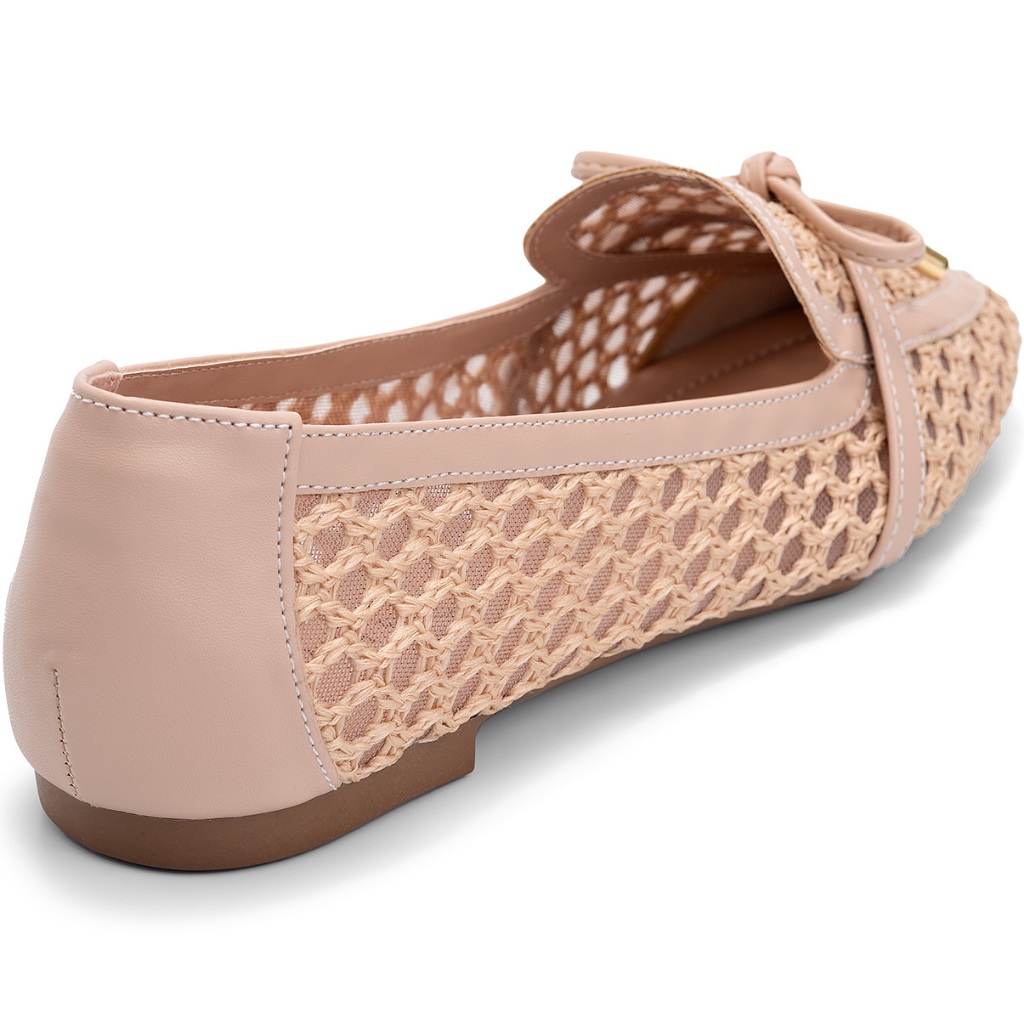 Mocassim Feminino Lumiss Material Natural Tela Trançado Bico Quadrado Confortável Nude