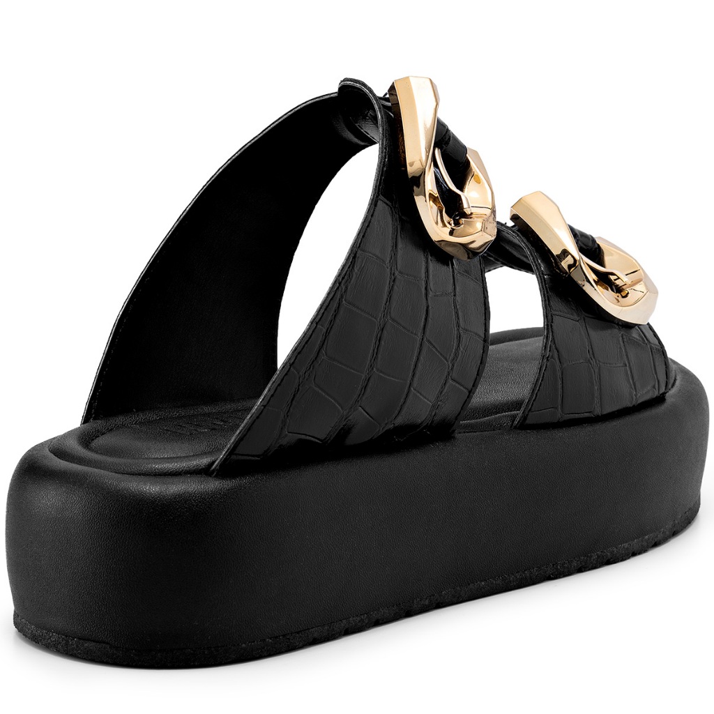 Sandália Flatform Feminina Lumiss Confortável Croco Fivelas Dourada Bico Redondo Preto