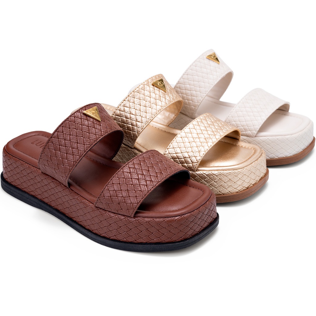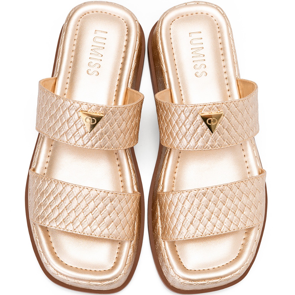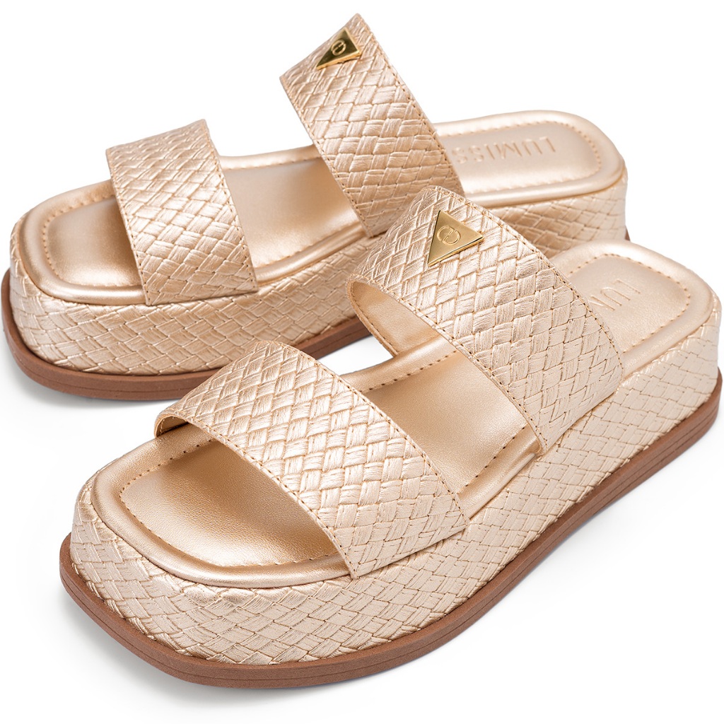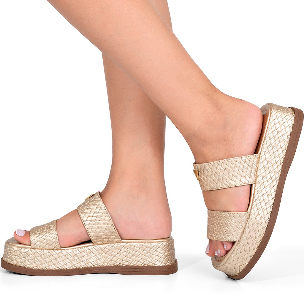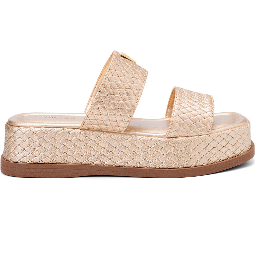 Sandália Feminina Lumiss Tamanco Flatform Confortável Enfeite Metalizado Tressê Dourado