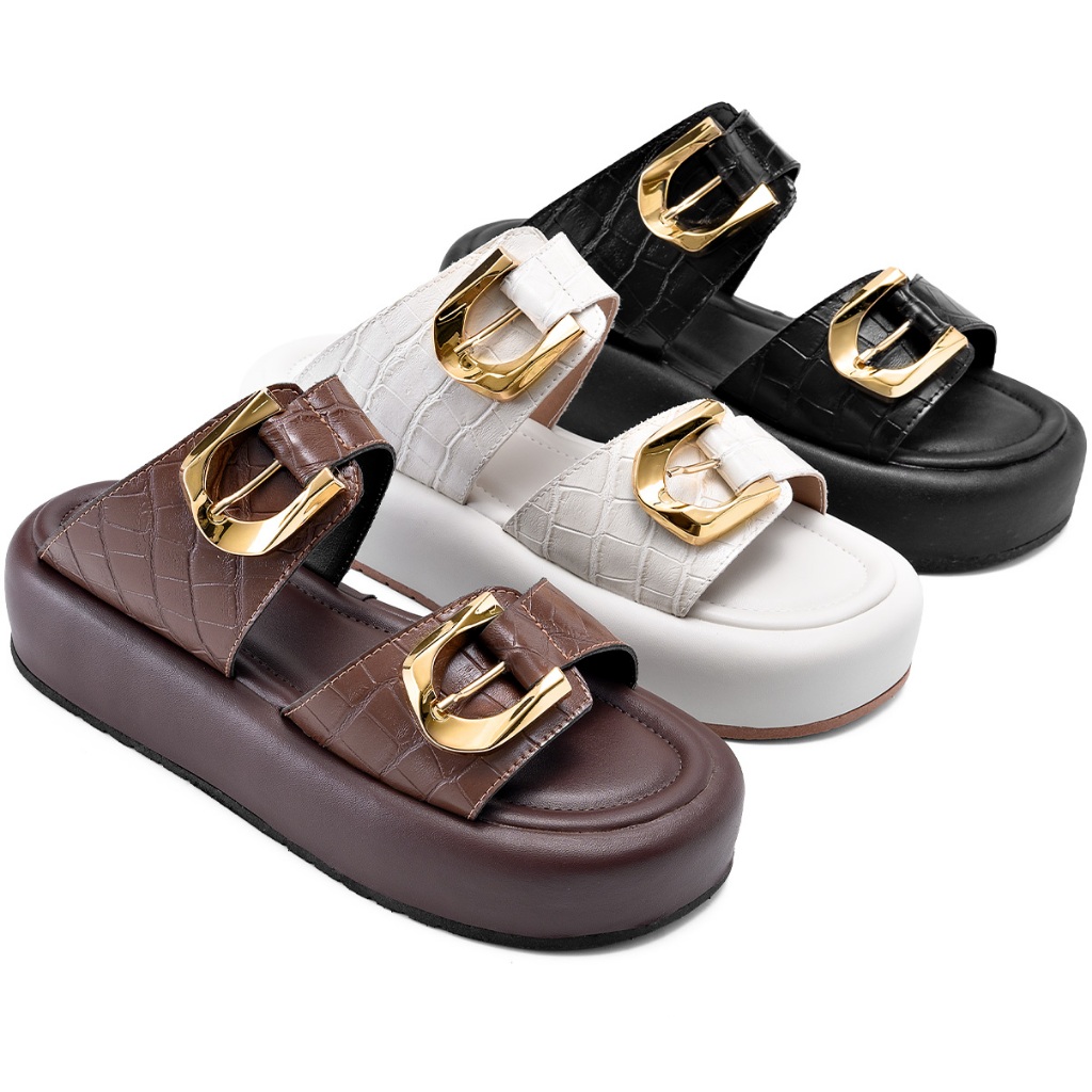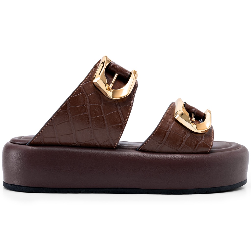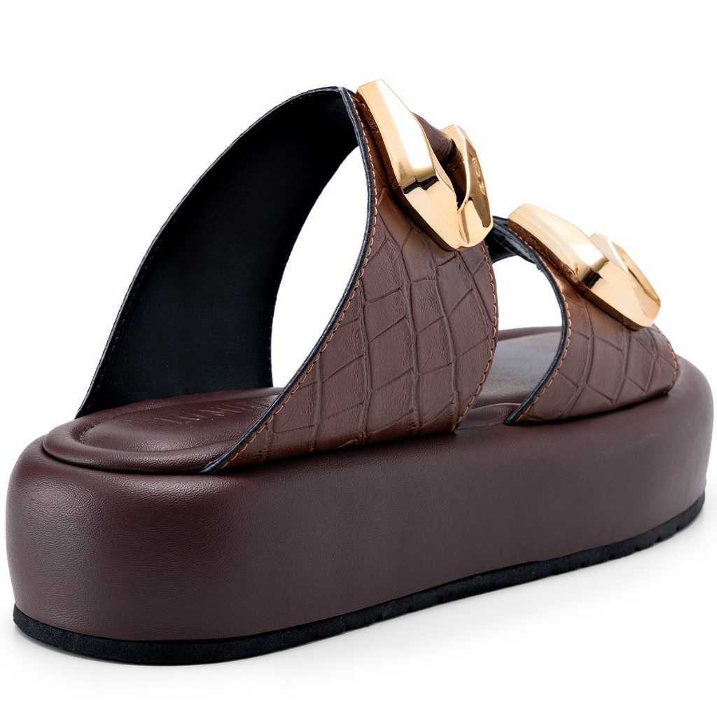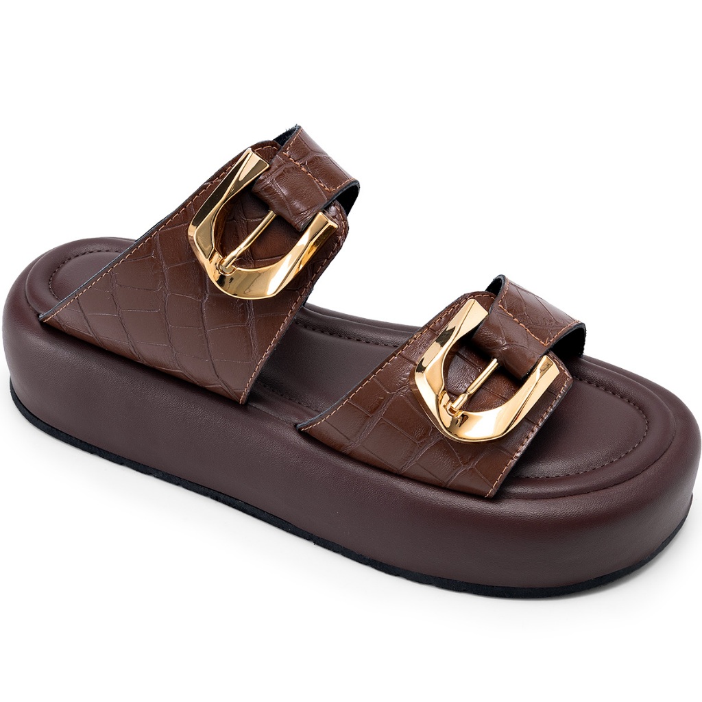 Sandália Flatform Feminina Lumiss Confortável Croco Fivelas Dourada Bico Redondo Marrom