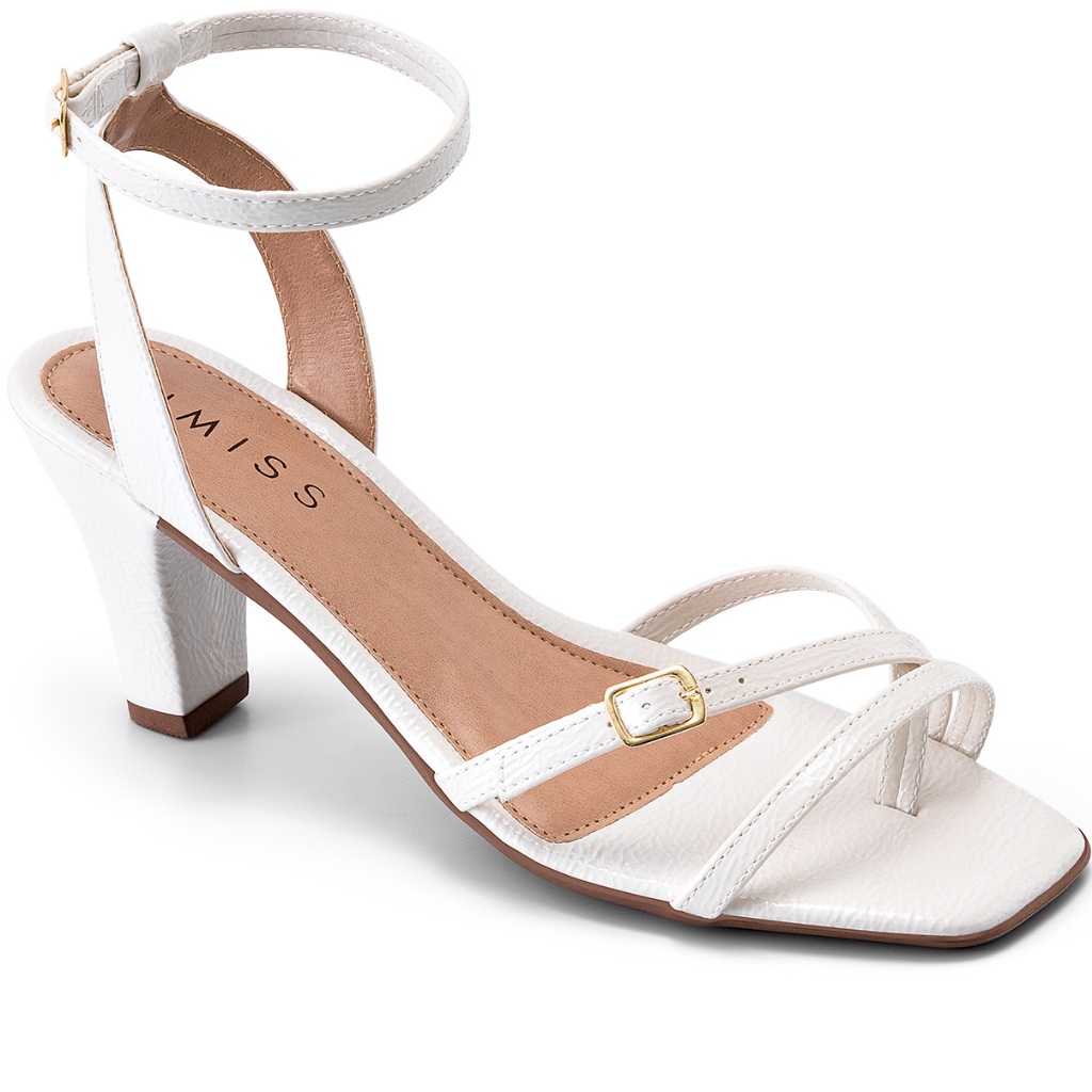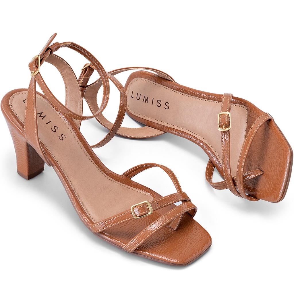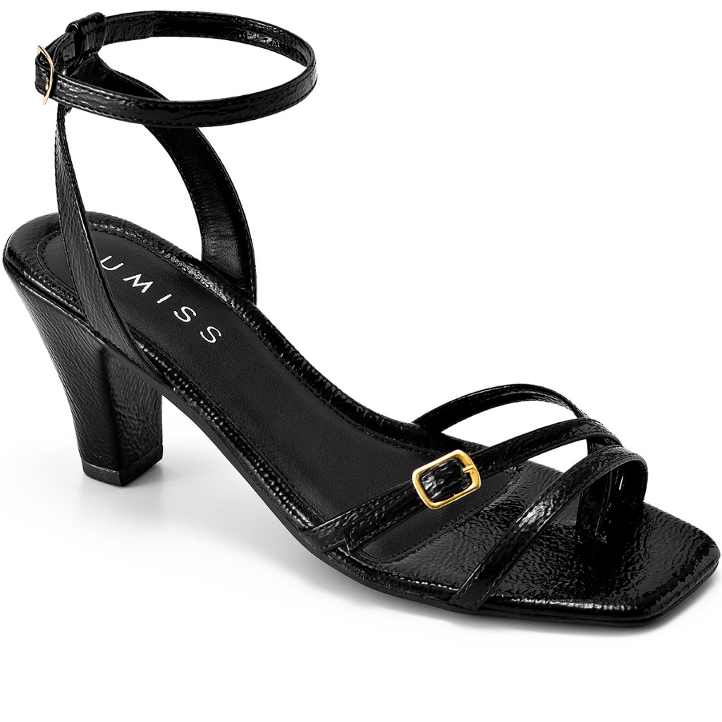Sandália Feminina Lumiss Verniz Salto Fino Médio Bico Quadrado Fivela Dourada