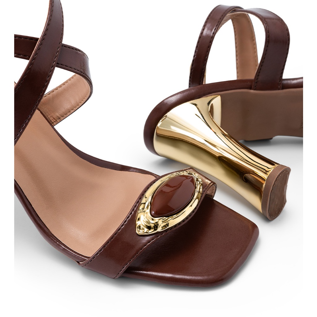 Sandália Feminina Lumiss Salto Alto Bloco Dourado Blogueira Enfeite Pedra Marrom