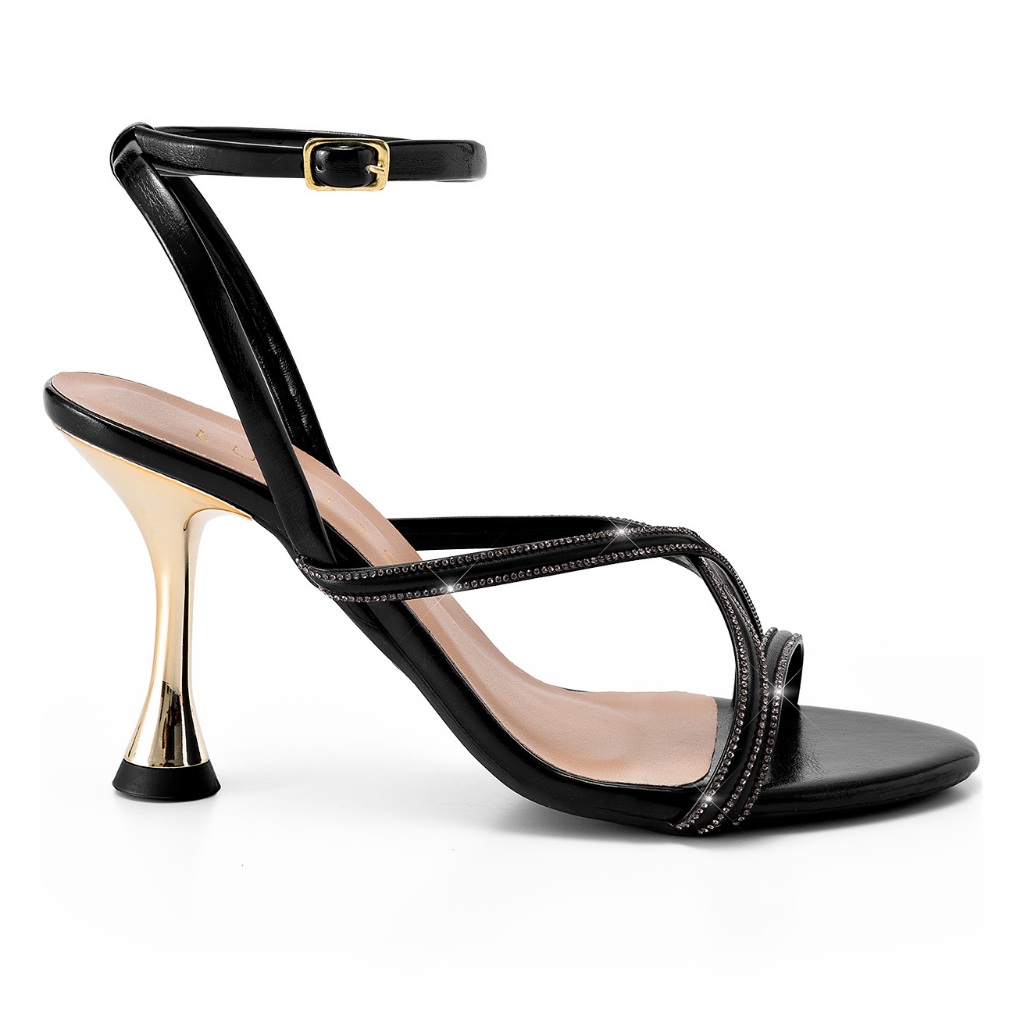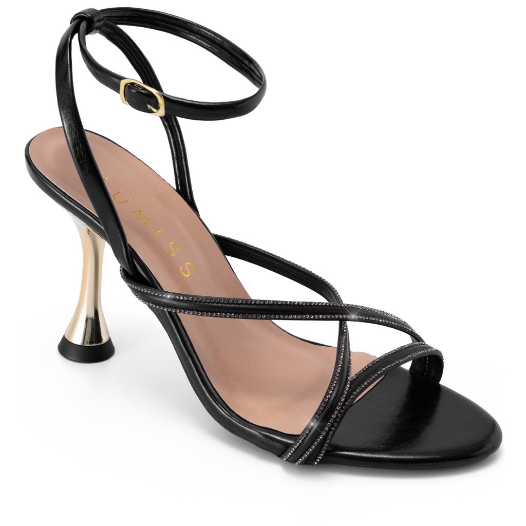 Sandália Feminina Lumiss Salto Alto Fino Metalizado Tiras Strass Preto
