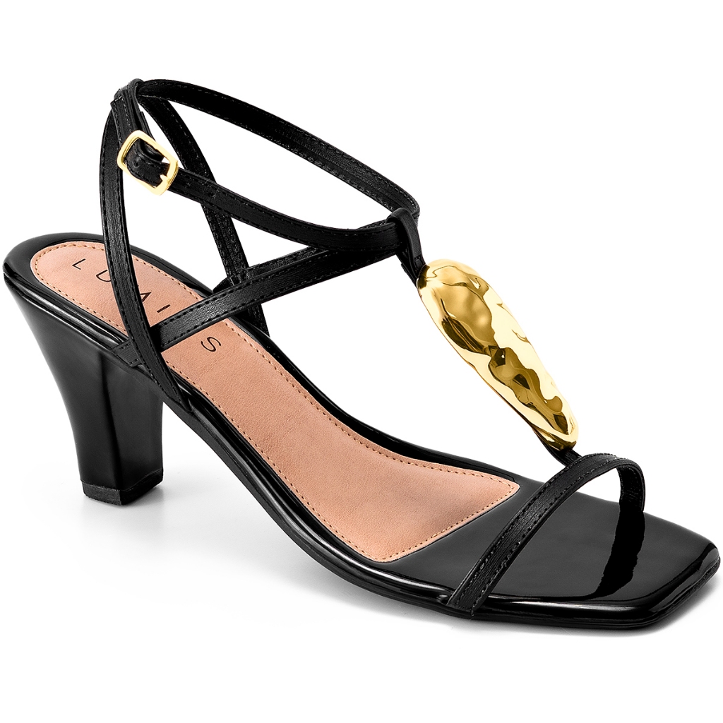 Sandália Feminina Lumiss Salto Fino Bico Quadrado Enfeite Pedra Metalizada Dourada Blogueira