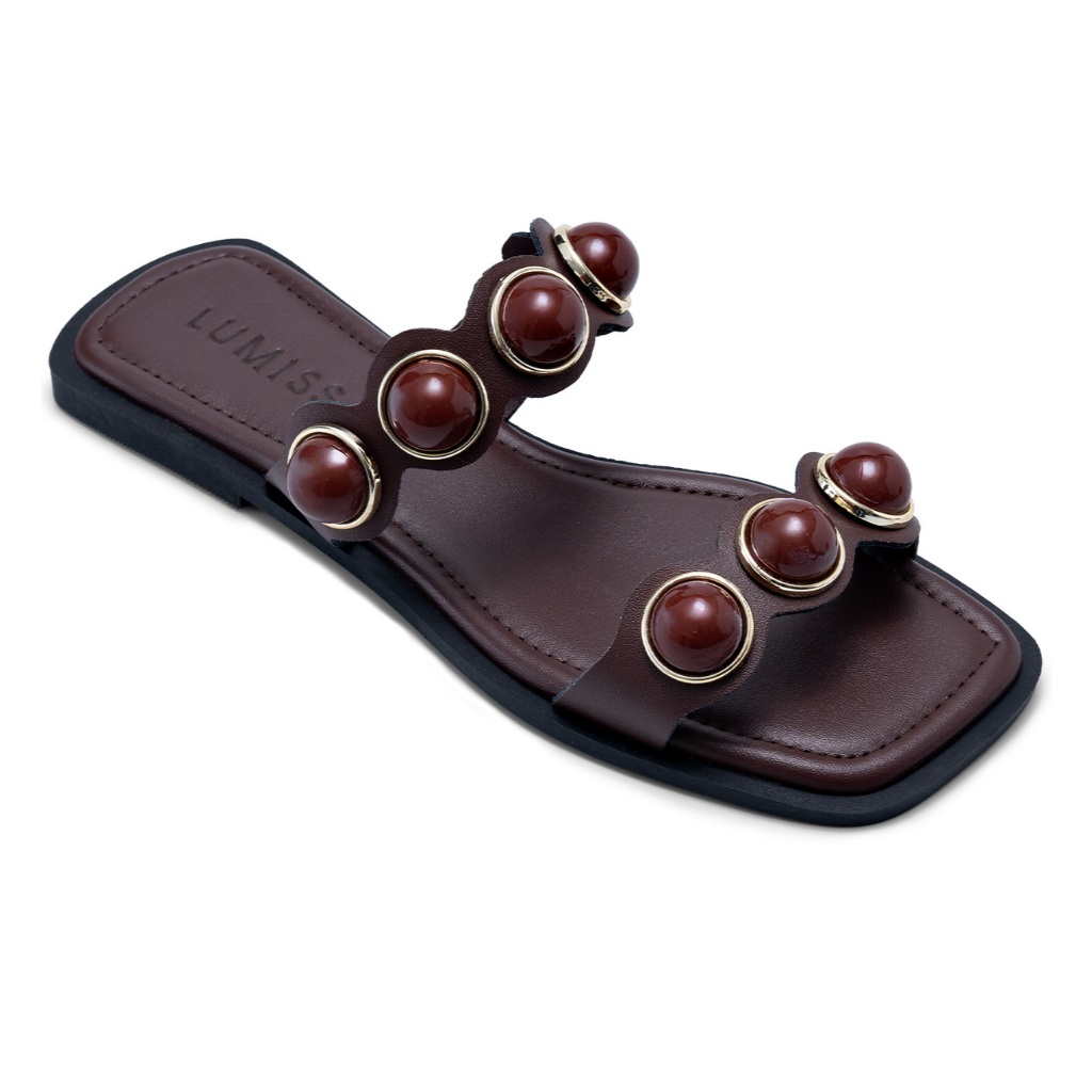 Sandália Rasteira Feminina Lumiss Confortável Esferas Enfeite De Bola Blogueira Marrom