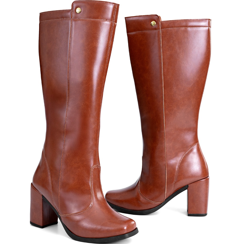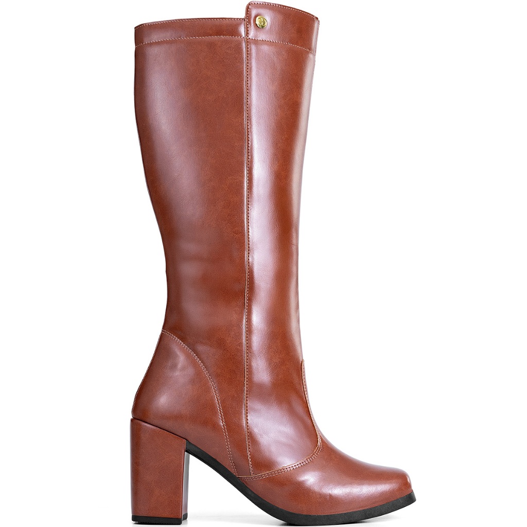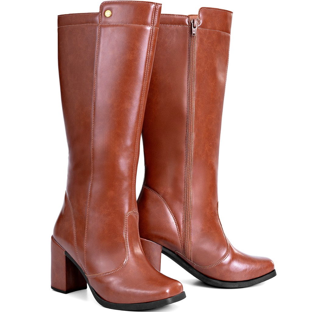 Bota Feminina Lumiss Cano Alto Salto Alto Bloco Confortável Bico Quadrado Caramelo