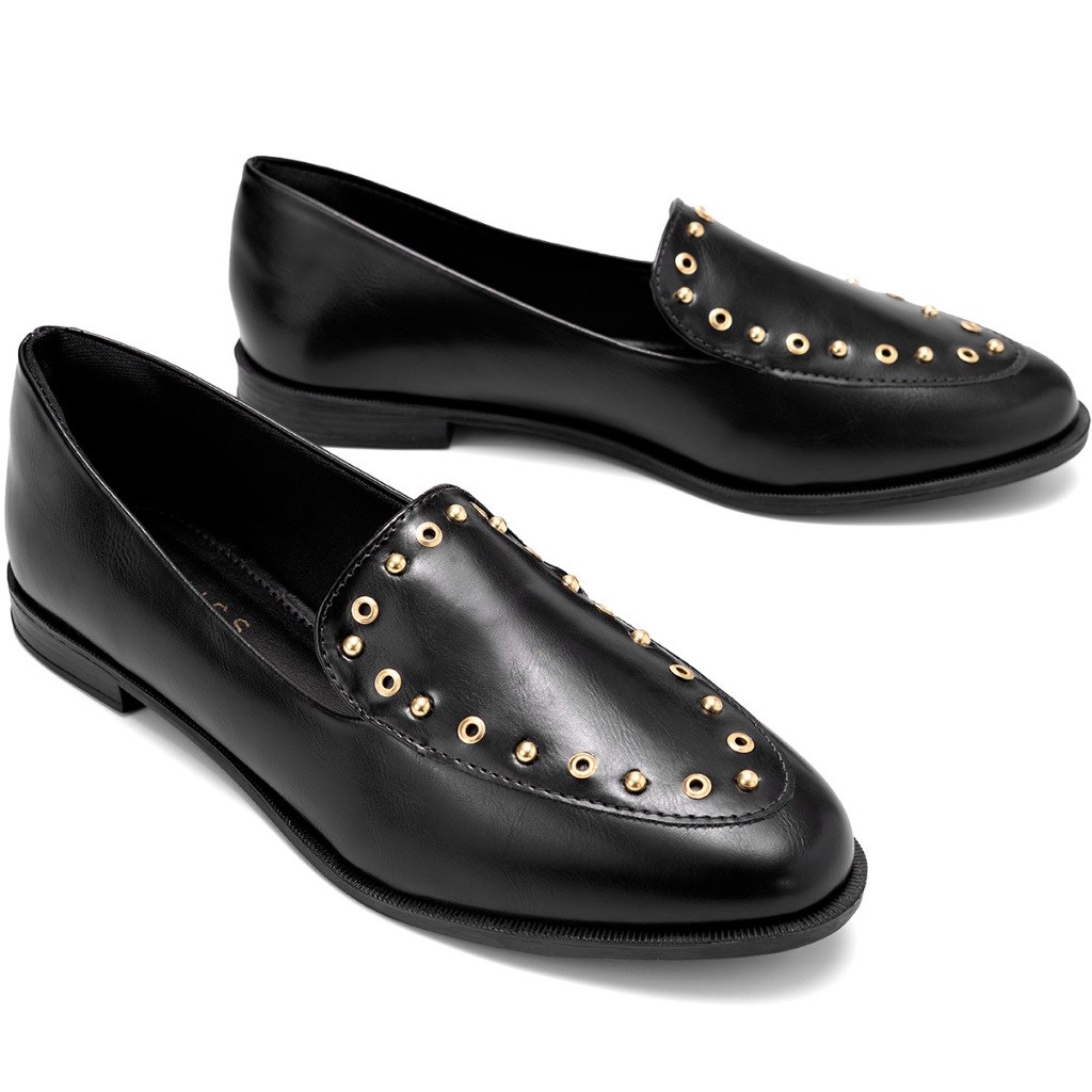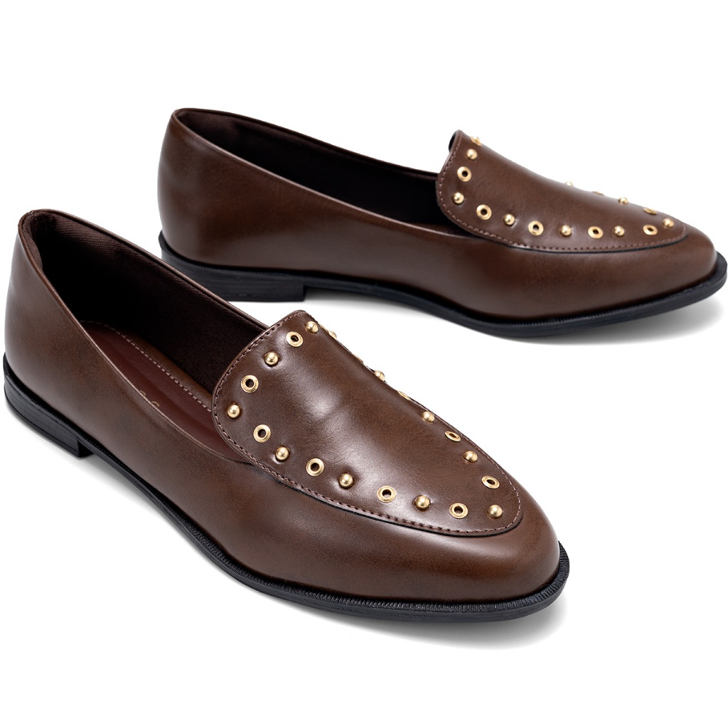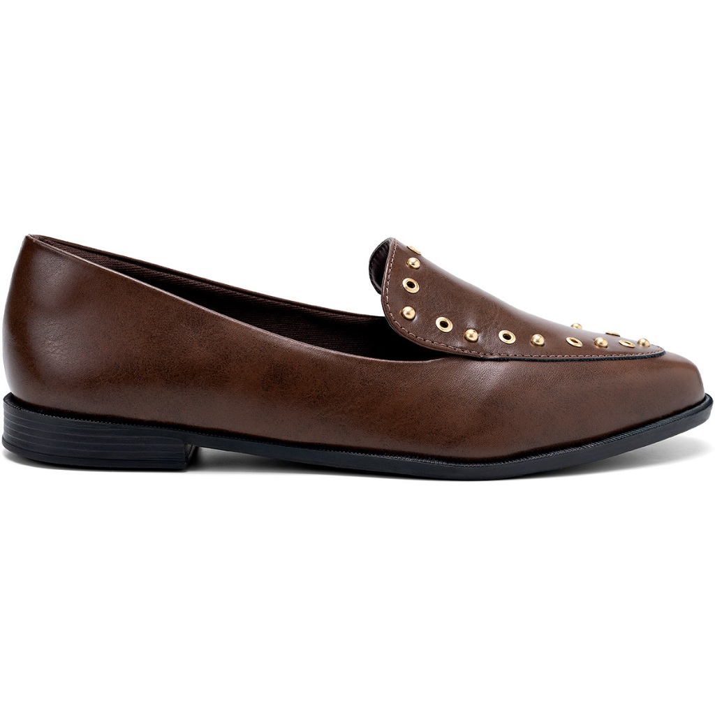 Mocassim Feminino Lumiss Baixo Bico Redondo Tachas Ilhós Dourado Confortável