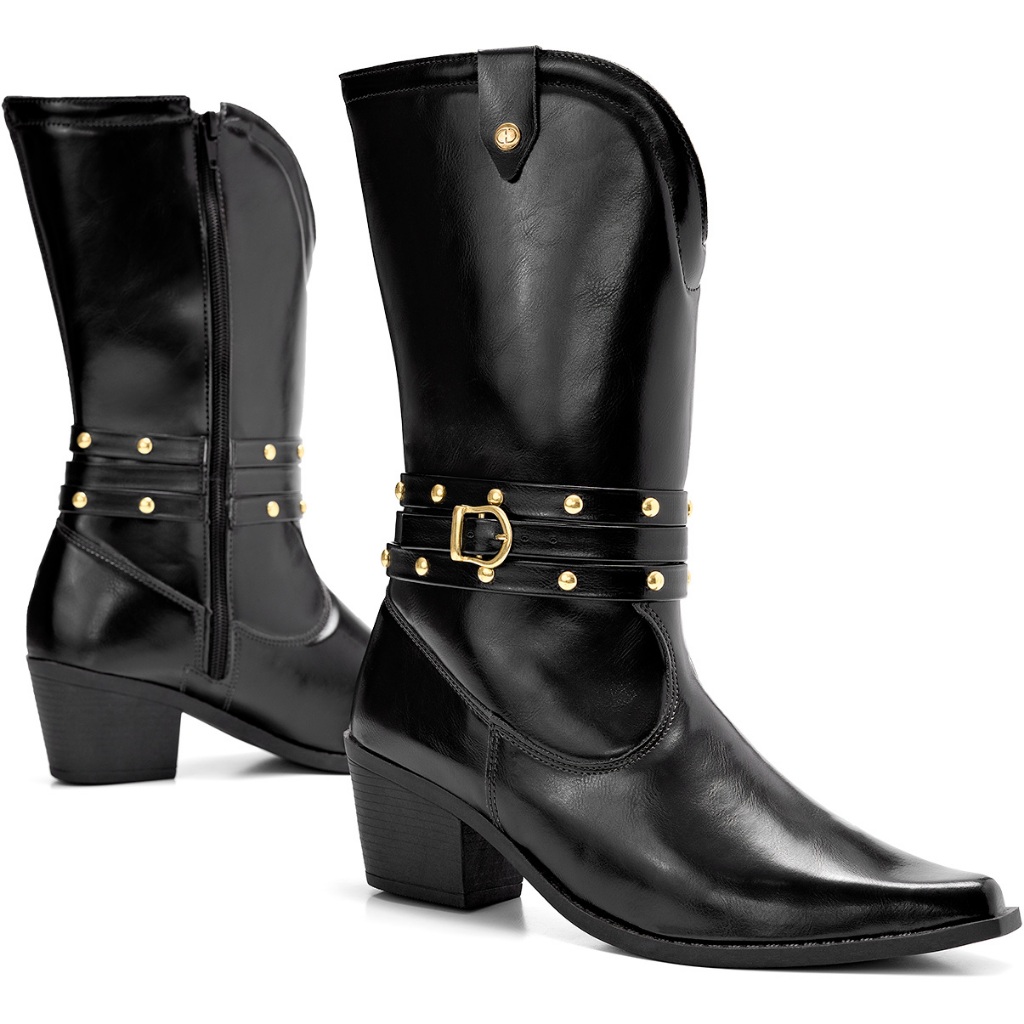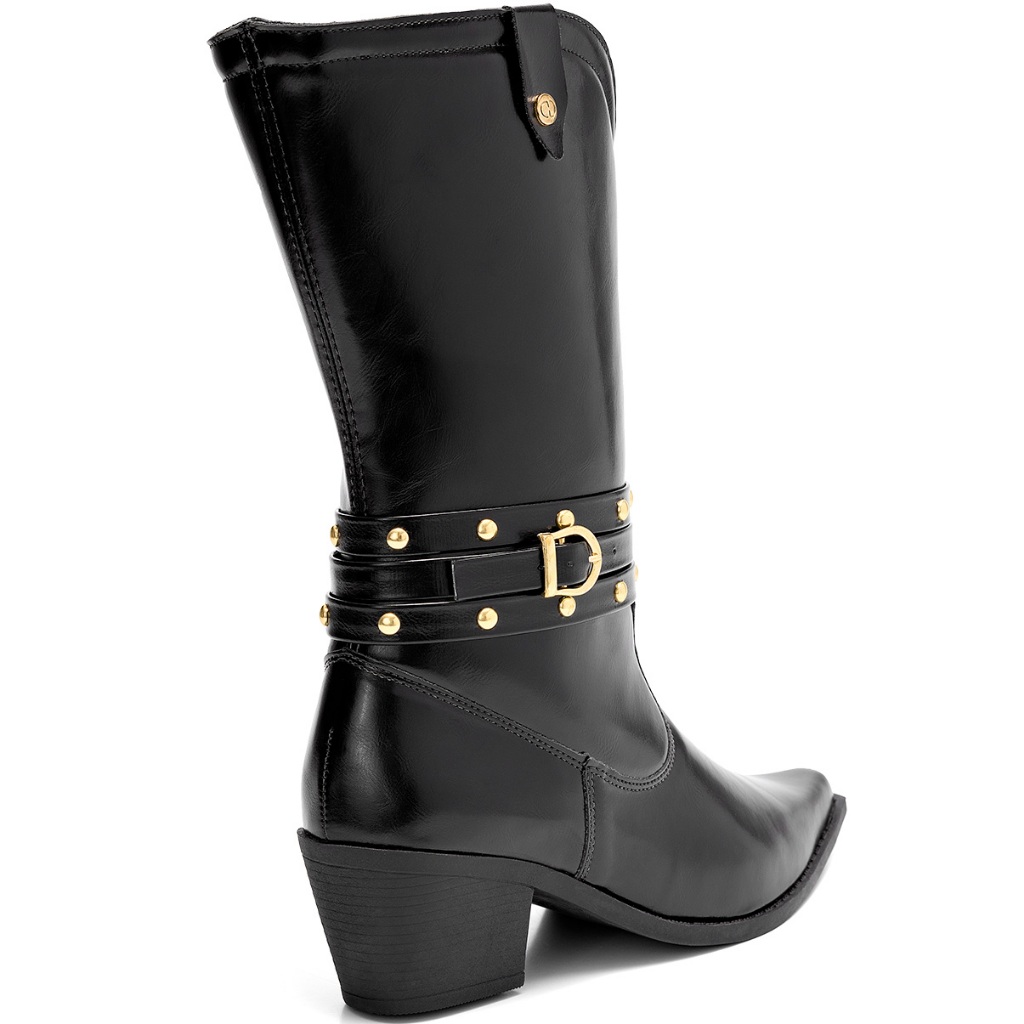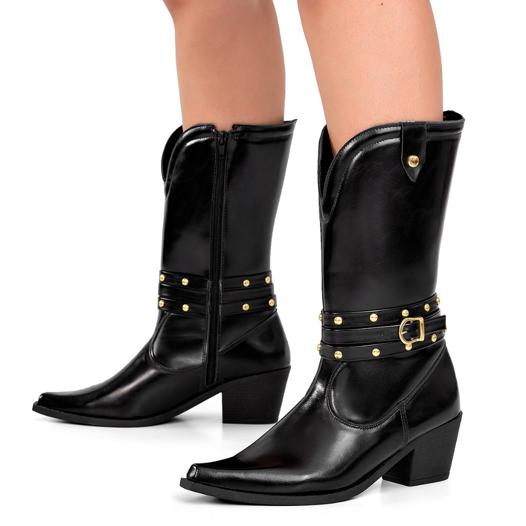 Bota Feminina Lumiss Western Cano Médio Salto Bloco Baixo Bico Fino Tachas Preto