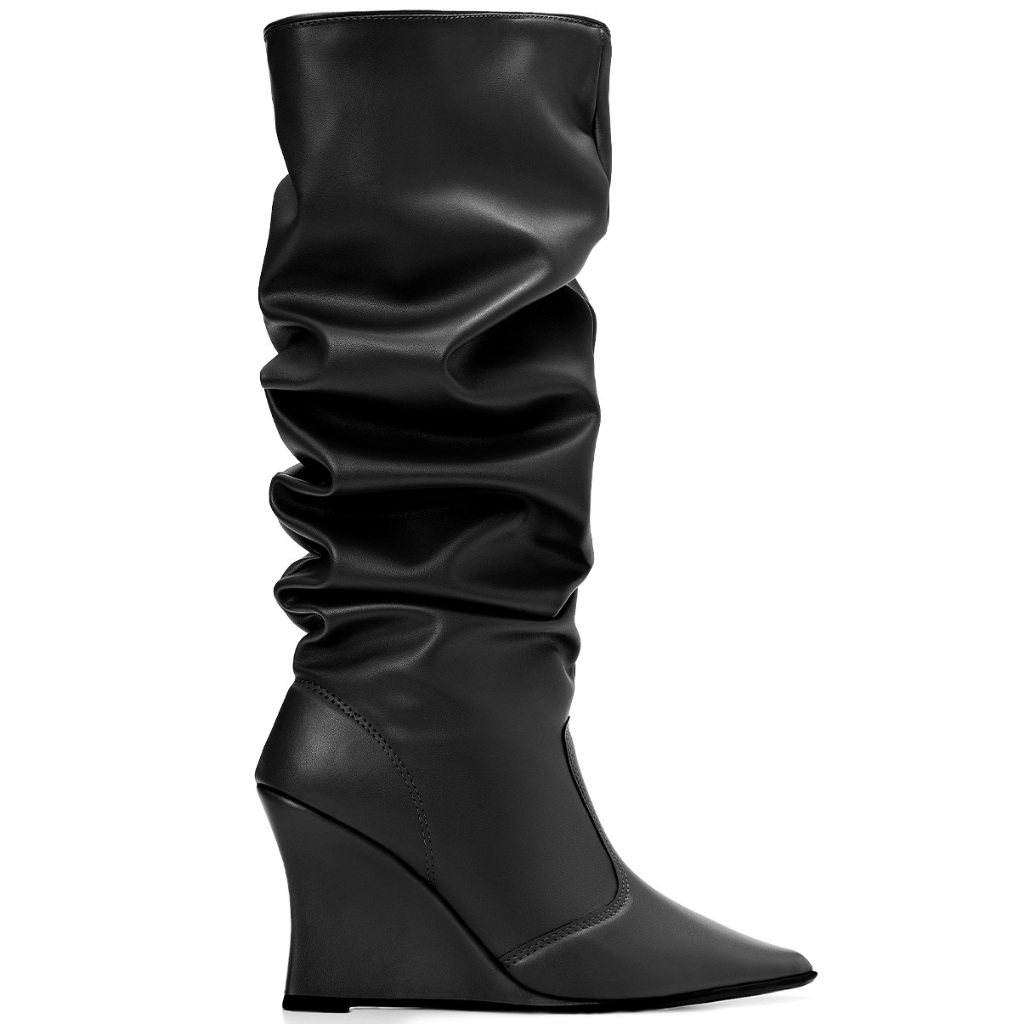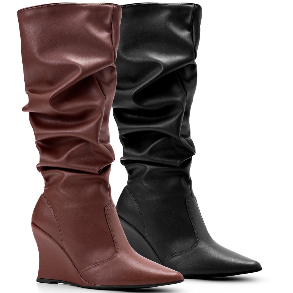Bota Feminina Lumiss Slouchy Enrugada Cano Longo Salto Anabela Bico Fino Preto