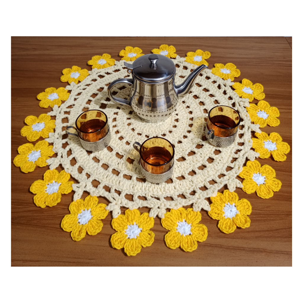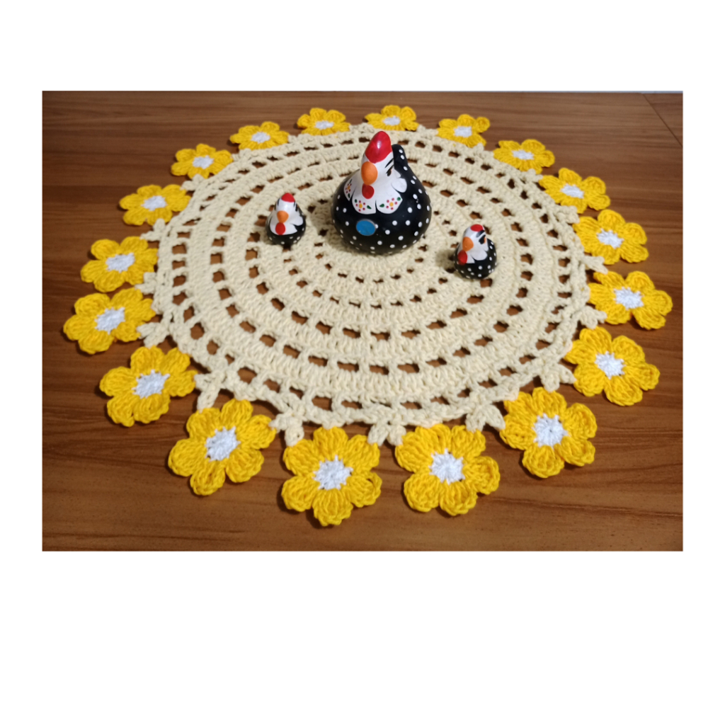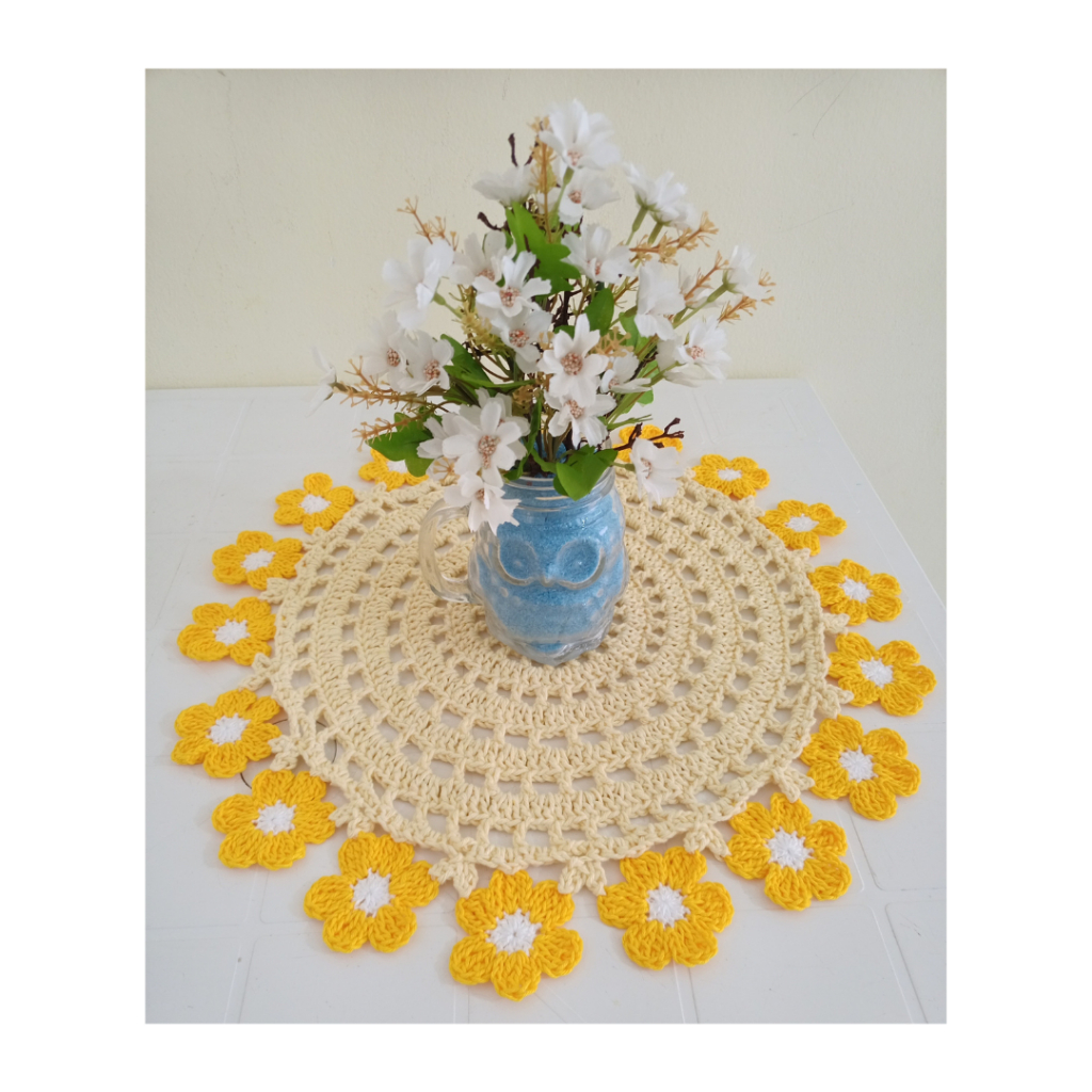 Toalha de mesa para Decoração tipo Sousplat Crochê Amarelo com Margaridas 46cm