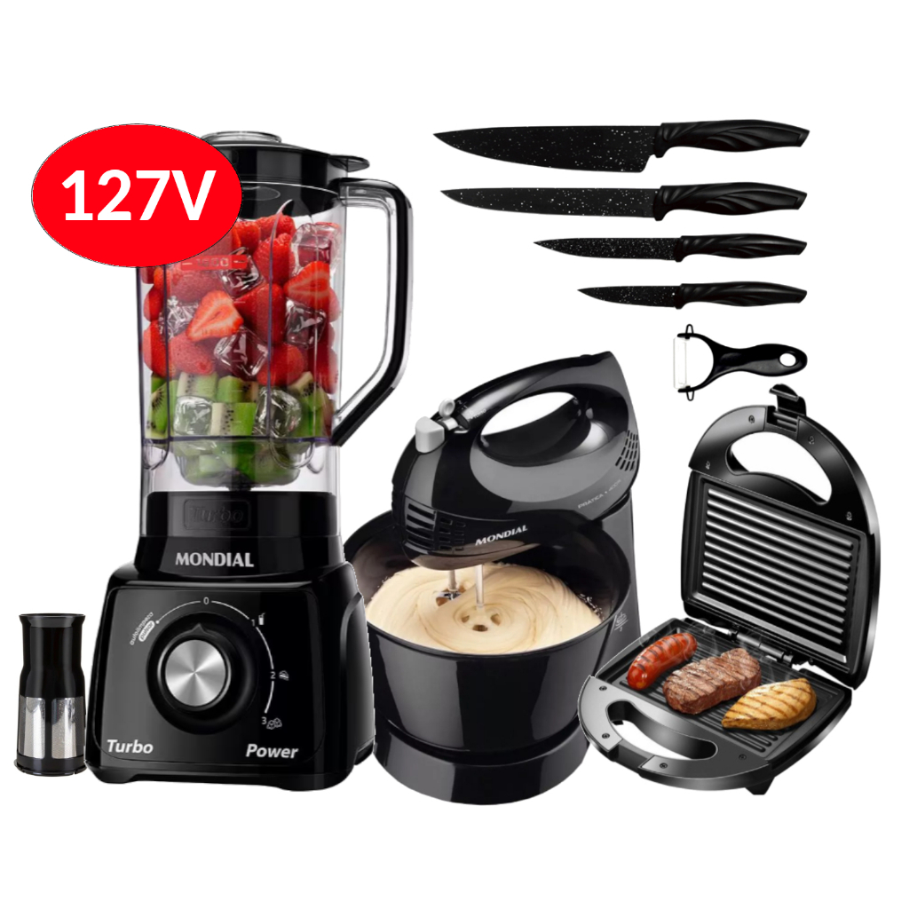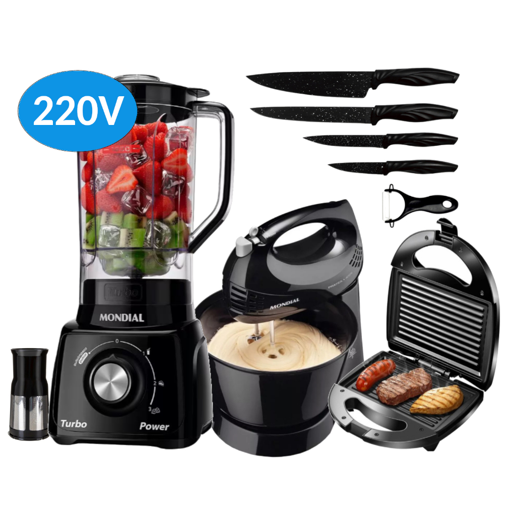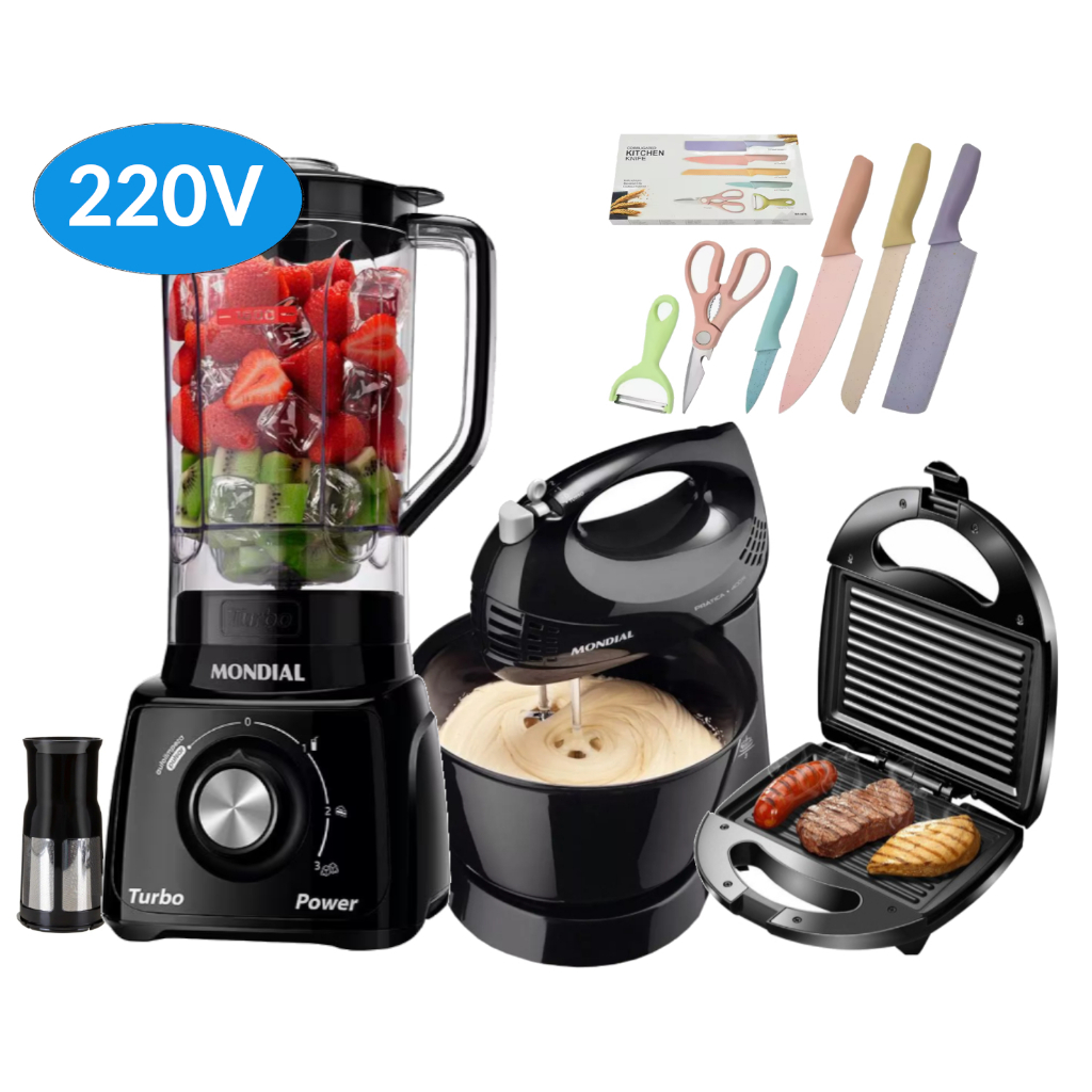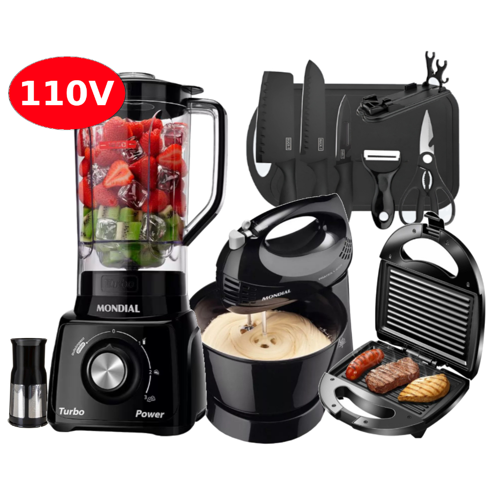 Kit Sanduicheira Grill + Liquidificador Mondial + Batedeira Facas Preta 220v / 110V