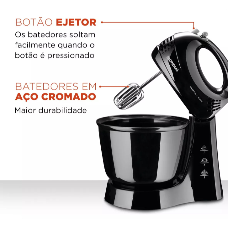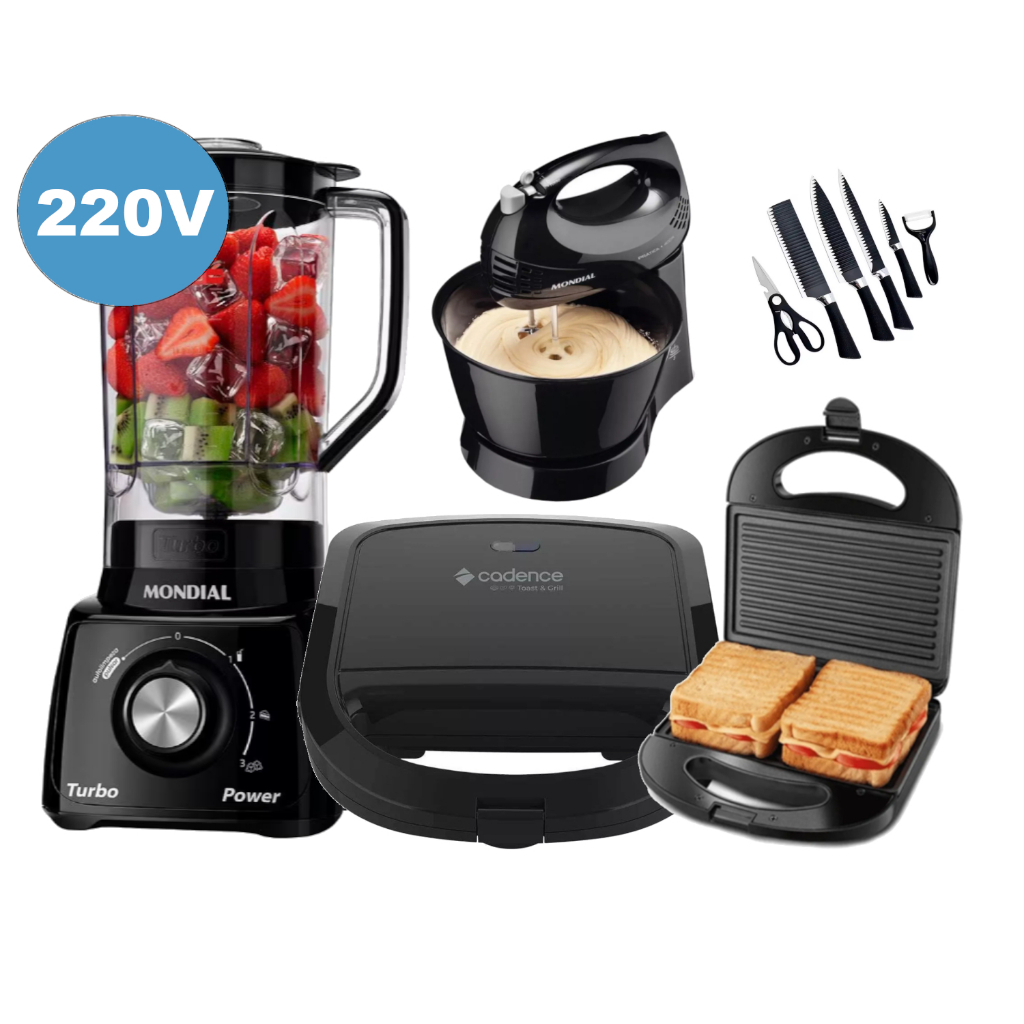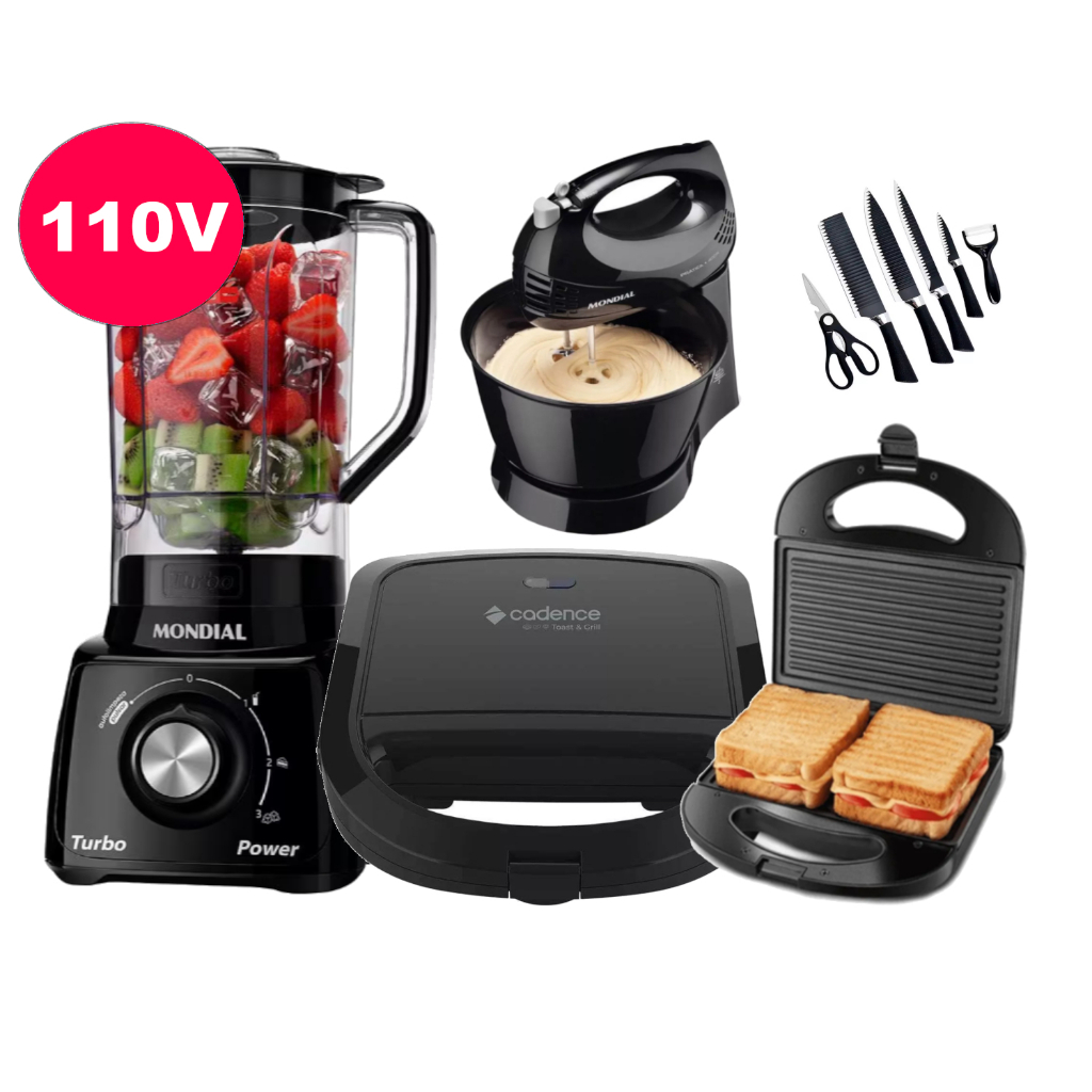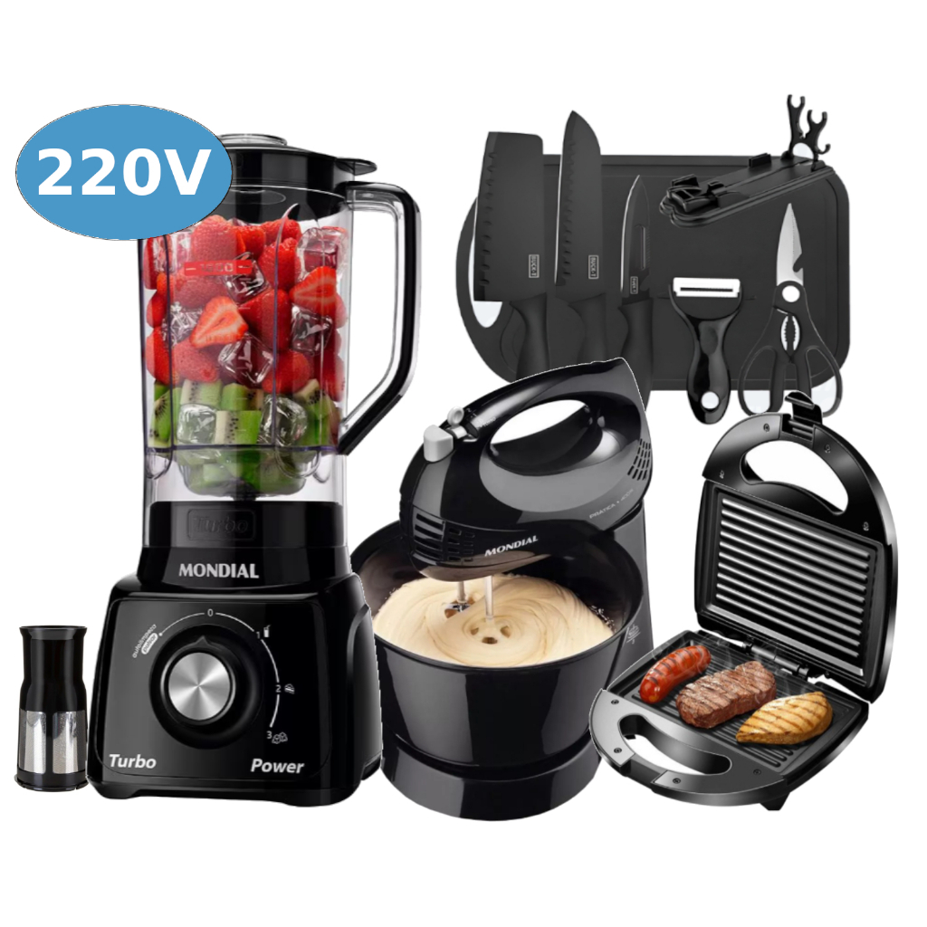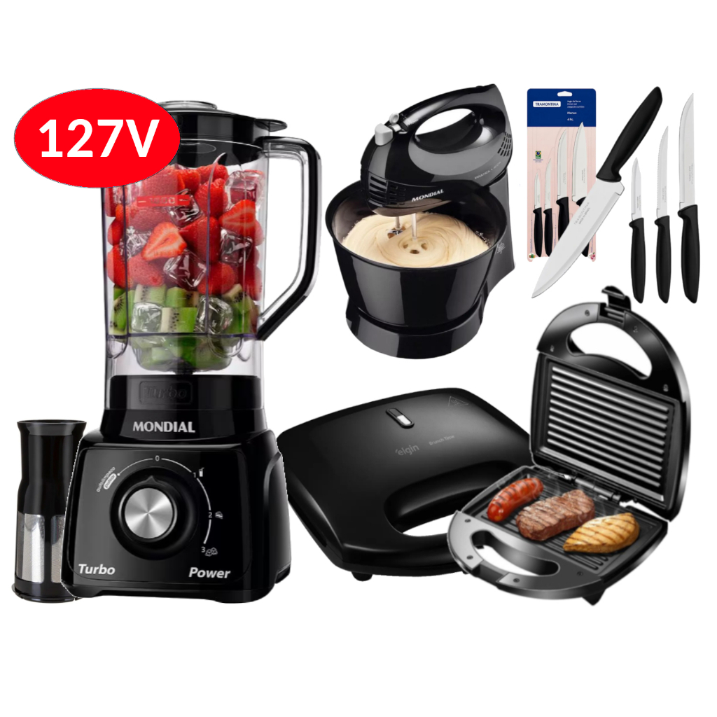 Kit Sanduicheira Grill + Liquidificador Mondial + Batedeira Facas Preta 220v / 110V