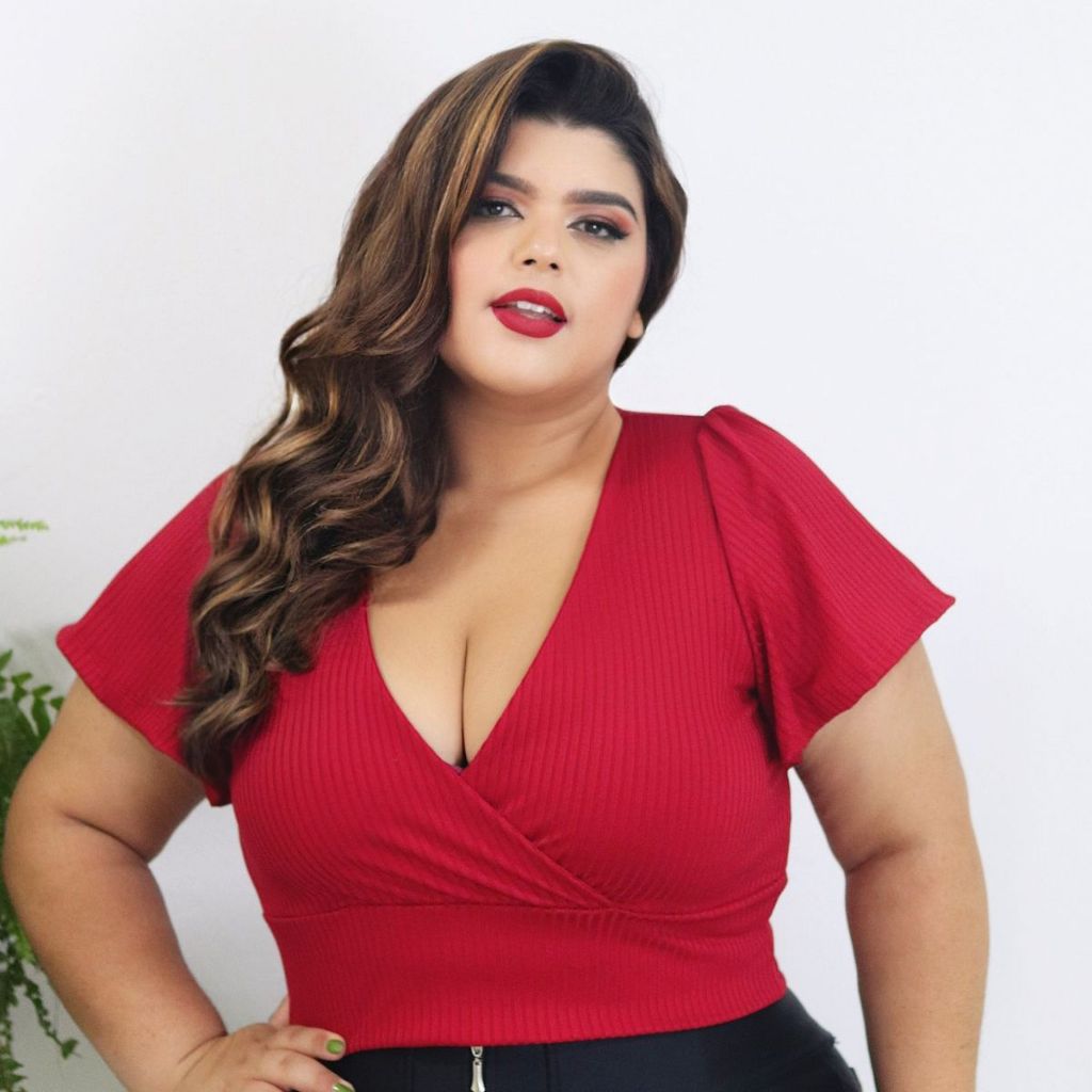 097 - Cropped Canelado Manga Flare Moda Feminina Plus Size