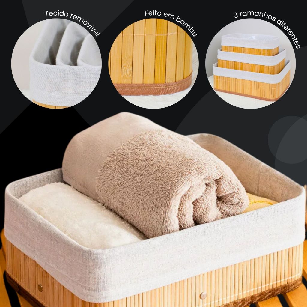 Kit 3 Cestos Organizadores de Bambu Multiuso com Forro