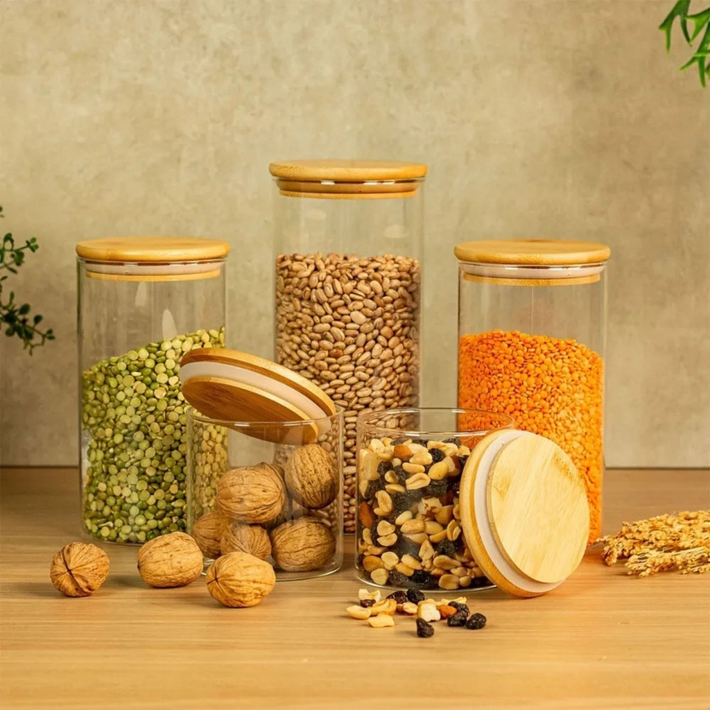 05 Potes de Vidro Hermético Transparente Tampa Bambu Porta Alimentos