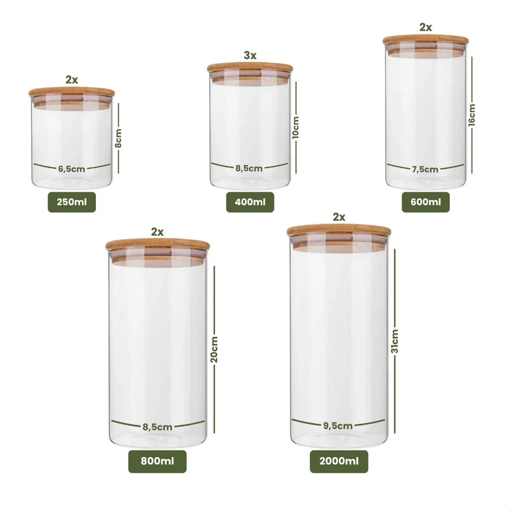Kit 11 Potes Herméticos de Vidro com Tampa de Bambu para Cozinha Mantimentos Alimentos