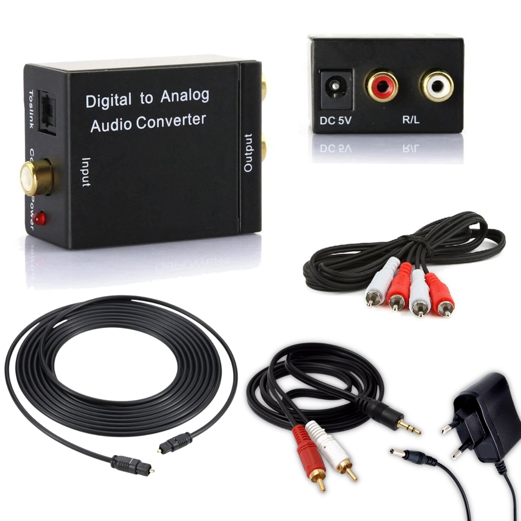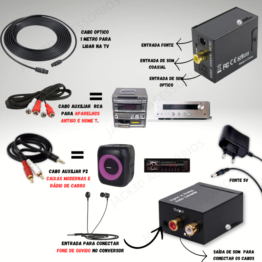 Kit Conversor Audio Digital Cabo Optico + RCA + Auxiliar P2 Smart Tv Home Theater Estereo