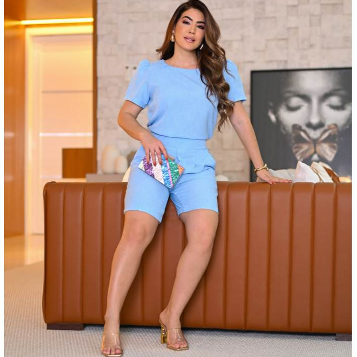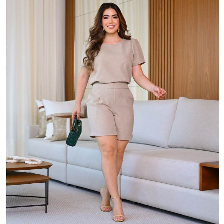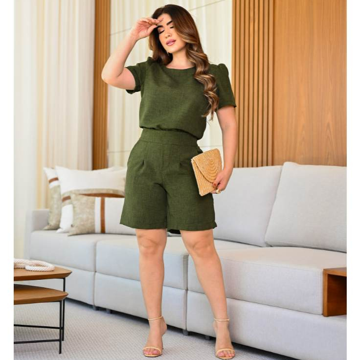 Conjunto Feminino Sofisticado De Bermuda Short Blusa em Linho De Algodão Cores Moda Primavera Verão 2025 Roupa Feminina