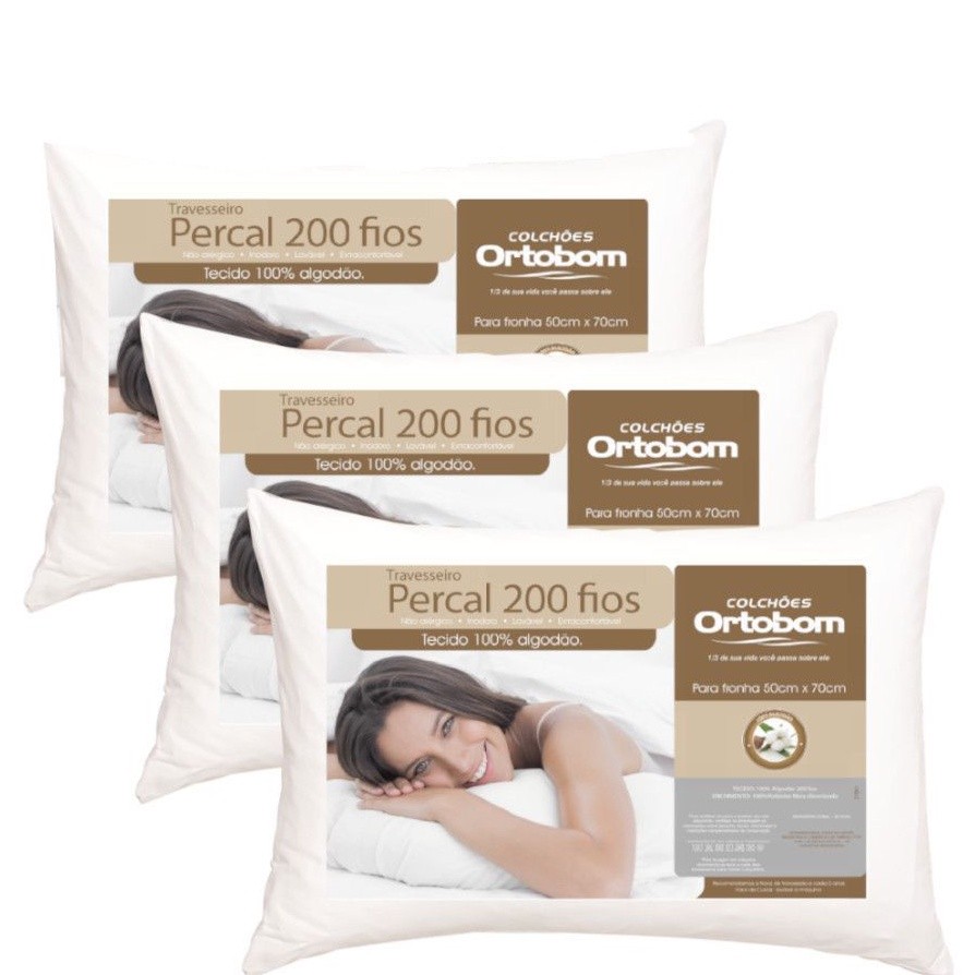 Kit 3 Travesseiros Ortobom Percal 200 Fios 50x70cm Antialérgico Perfl Alto