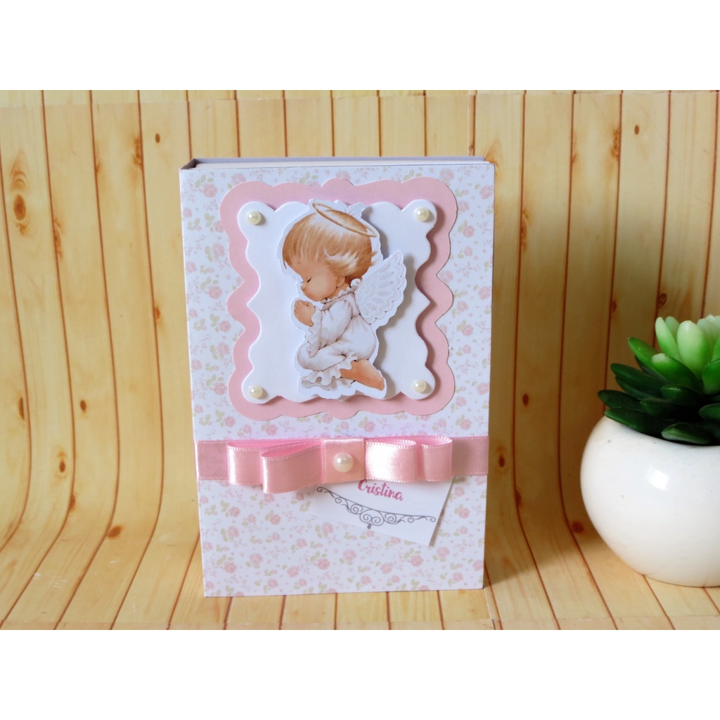 Caixa convite para padrinhos de batismo com foto rosa acompanha mini terço - escolher texto no chat