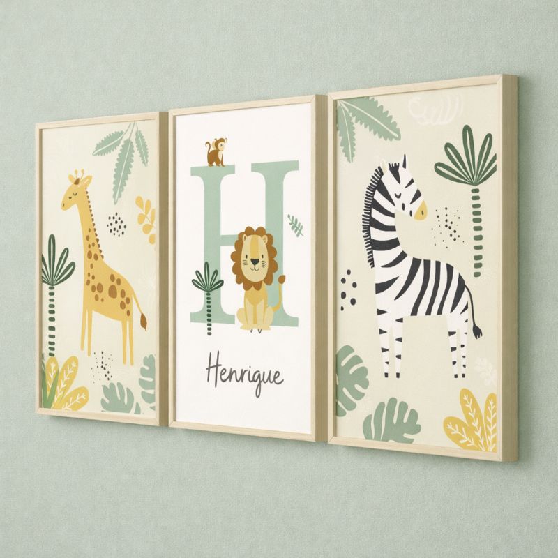 Kit 3 Quadros Decorativos Infantil Safari Personalizado Com Nome Decoração Quarto Menino