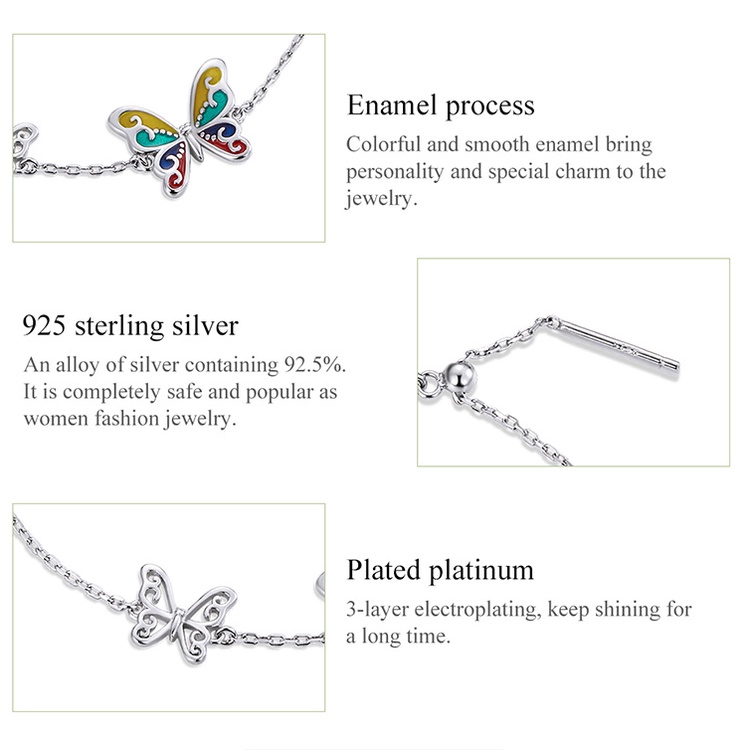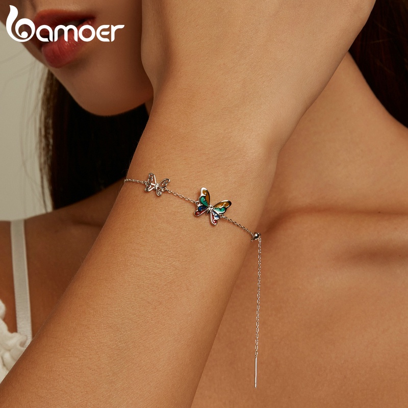 Bamoer 925 Pulseira De Prata Borboleta Colorida 20 Cm Cadeia Ajustável Moda Jóias Presentes Para Mulheres SCB228