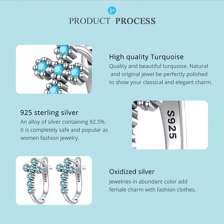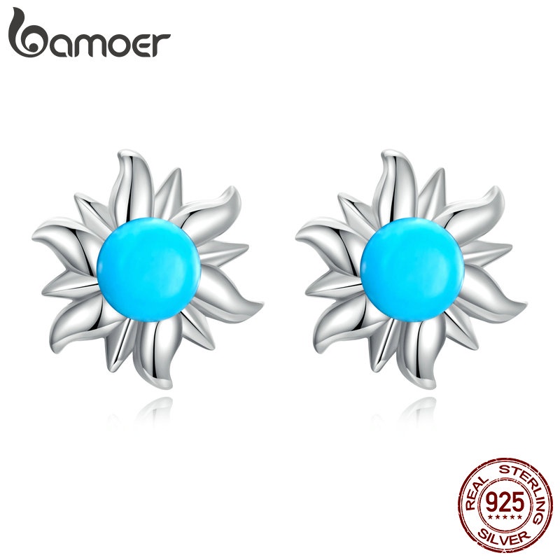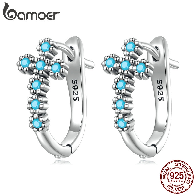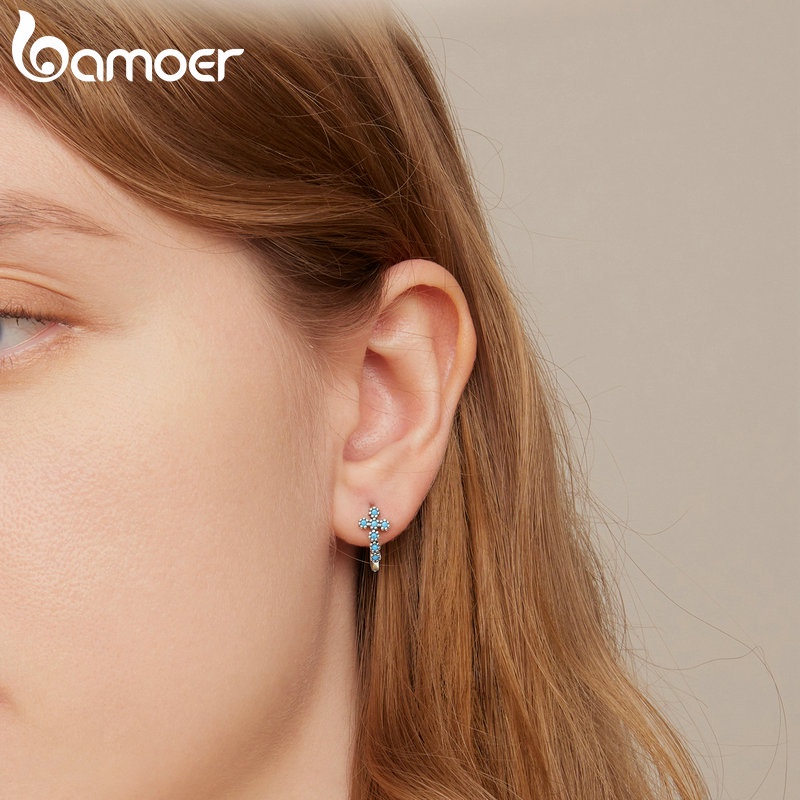 Bamoer Brincos S925 Moda Azul Sol Cruz Studs Brinco Fivelas De Prata Mulheres Meninas Jóias Presente