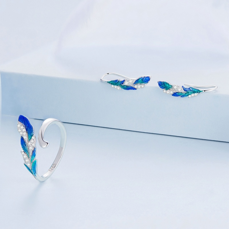 Bamoer 925 Prata Deslumbrante Anel De Abertura De Penas Azul Para Mulheres Moda Simples Joalheria