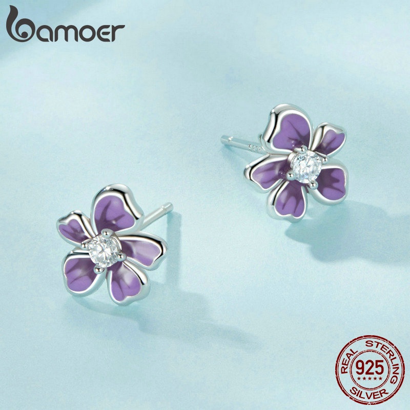 Brincos Bamoer 925 Sterling Sliver De Fita Flor Roxa Jóias Para Mulheres