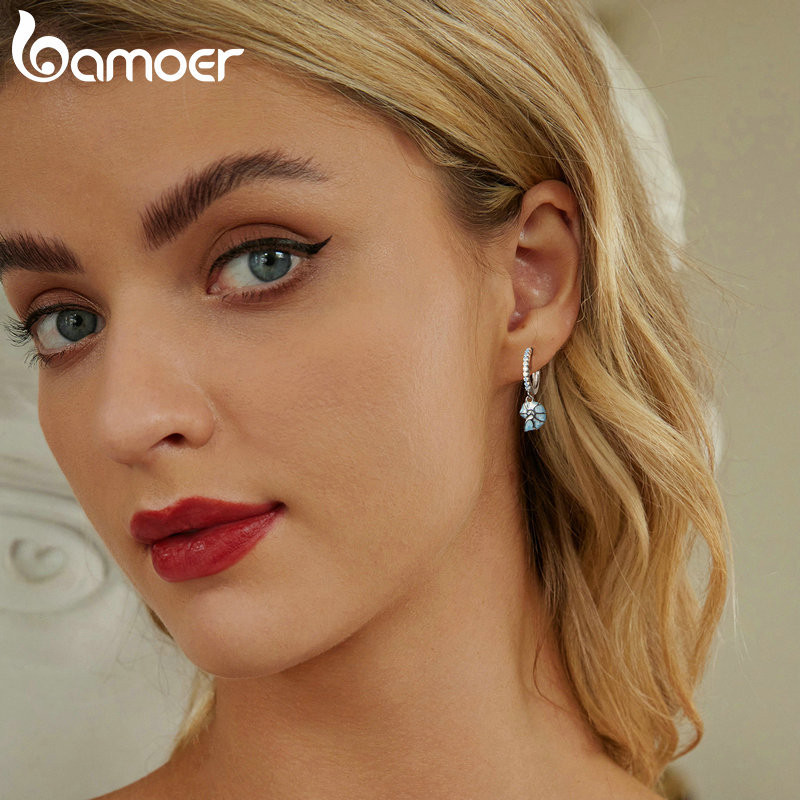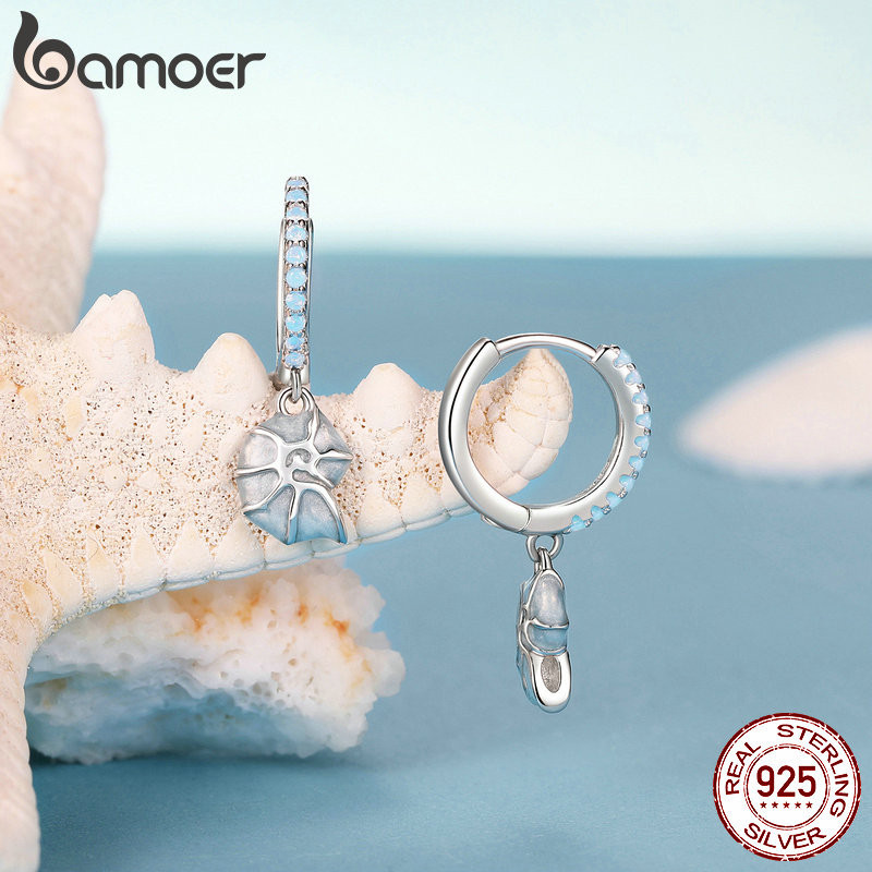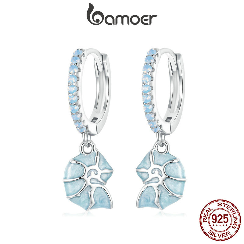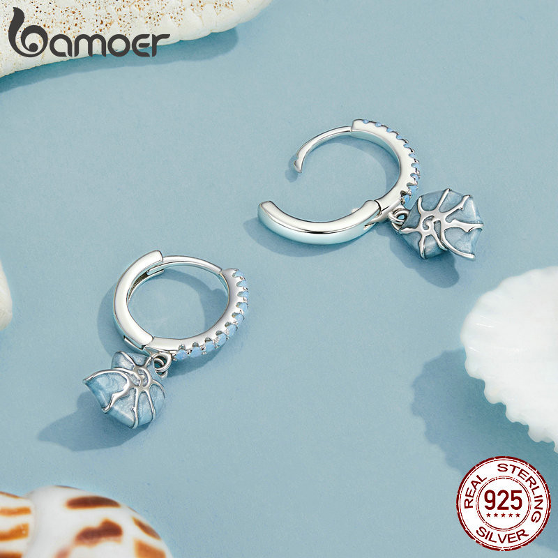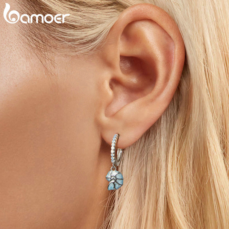 Brincos Bamoer 925 Sterling Sliver Hoop Blue Seashell Design Jóias De Ocasião Diária Presentes Para Mulheres