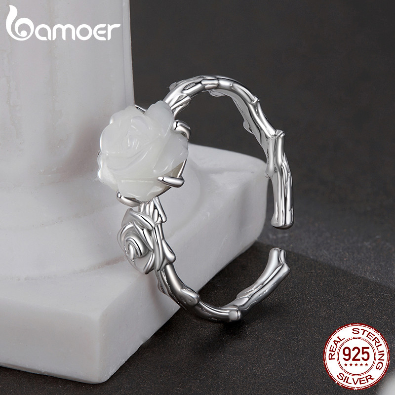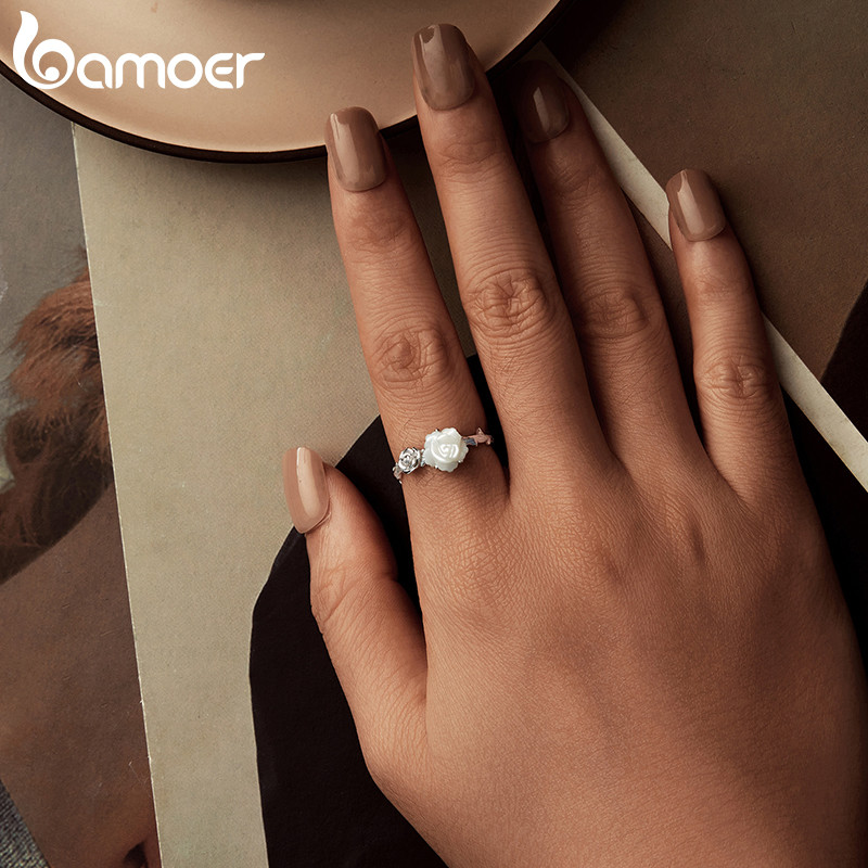 Bamoer 925 Sterling Sliver Anel Aberto Ajustável Rosa Branca Moda Joias Presentes Para Mulheres