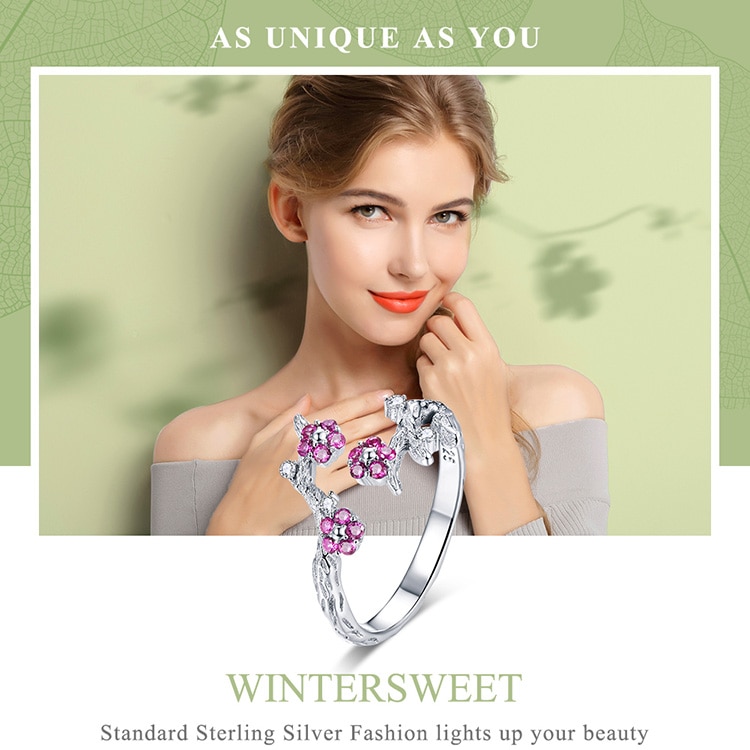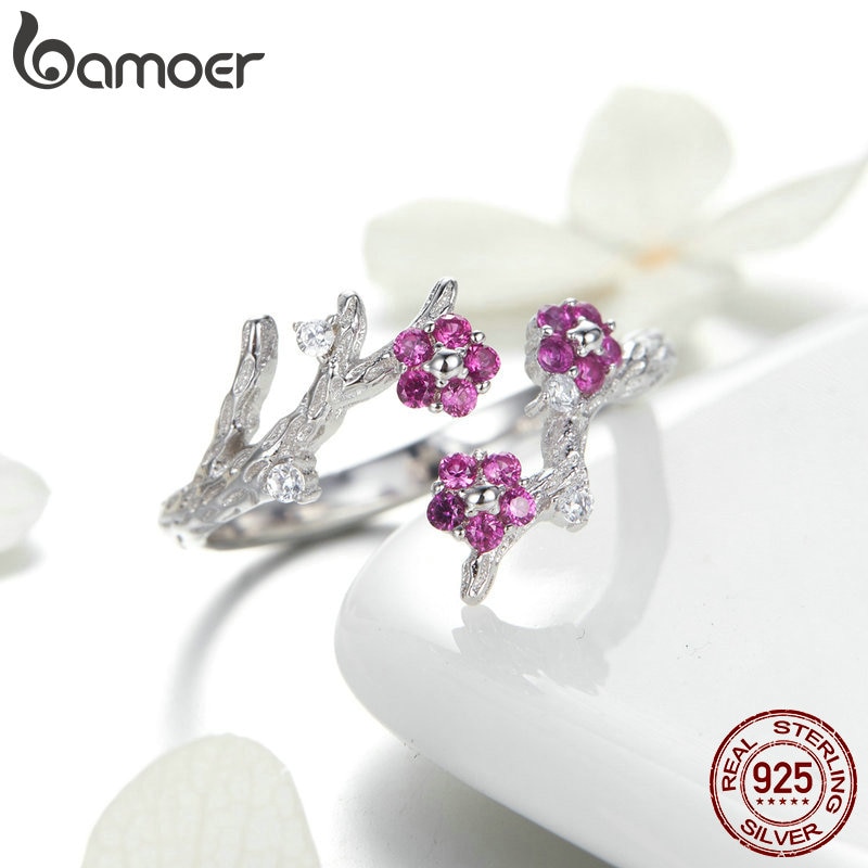 Bamoer 100 % Inverno Prata Esterlina 925 Blooming Ameixa Flor Anéis De Tamanho Aberto Para As Mulheres Engagement Jóias BSR022