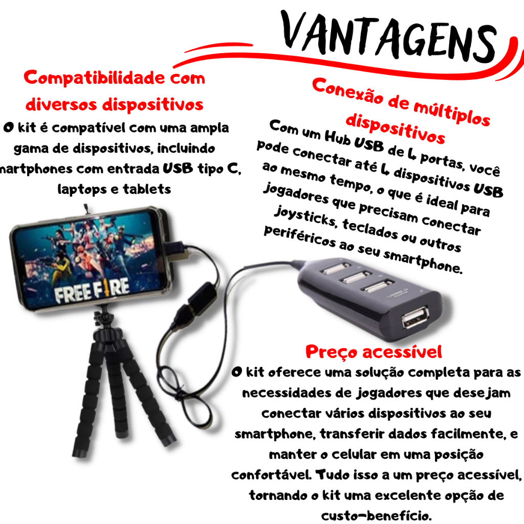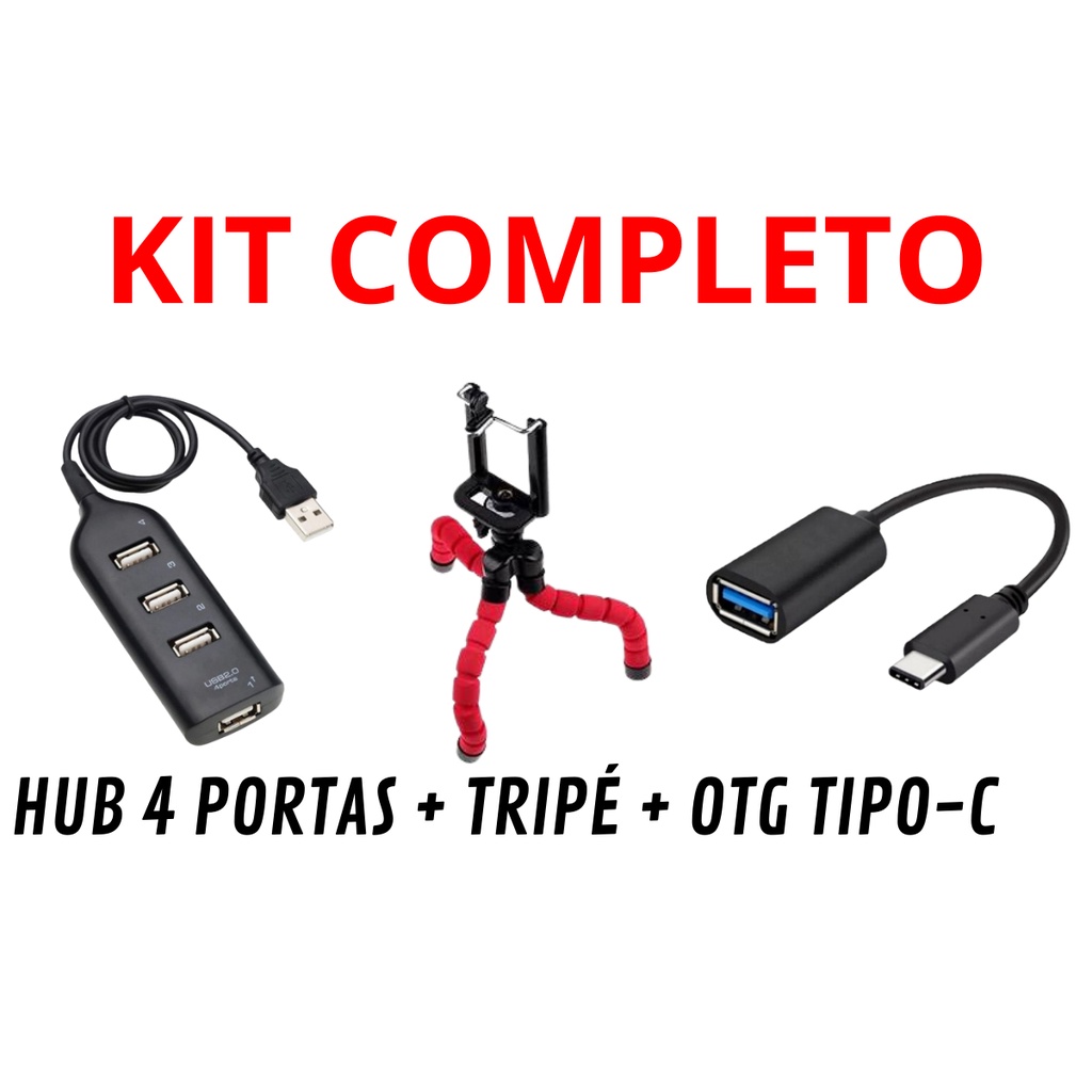 Kit Mobilador Hub 4 Portas USB + Cabo Adaptador OTG Tipo-c / Micro Usb V8 + Mini Tripe Suporte De Celular