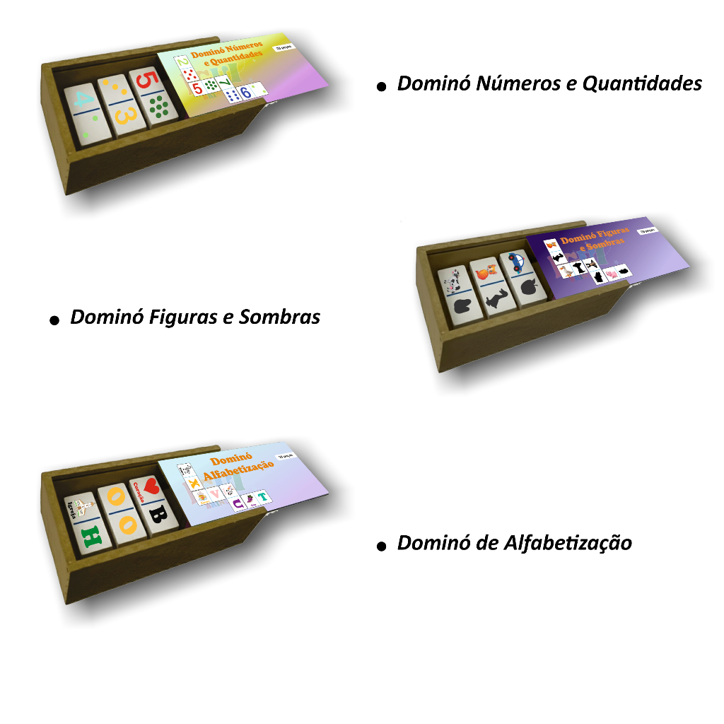 Kit 3x Dominó Pedagógico MDF 28 peças Brinquedo Educativo Infantil Montessori - Vários Temas