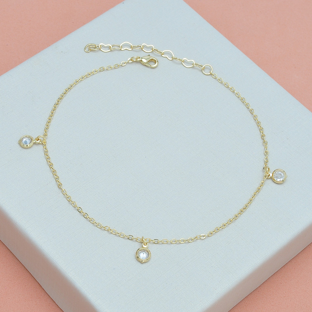Tornozeleira Feminina Dourada Cristais Banhada a Ouro 18k