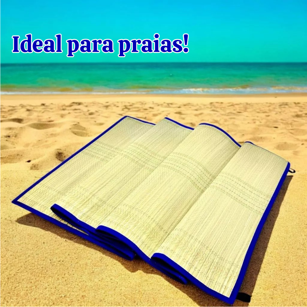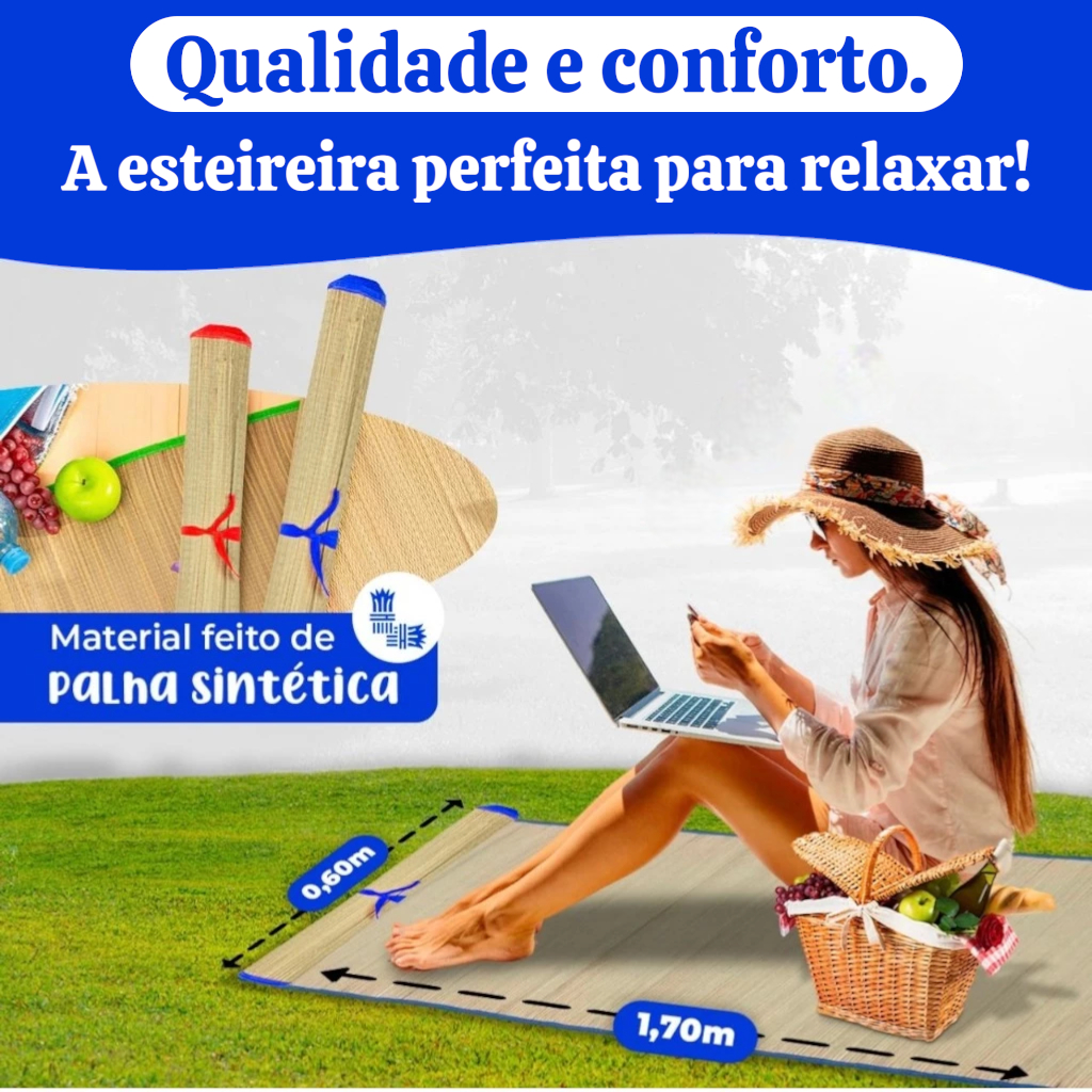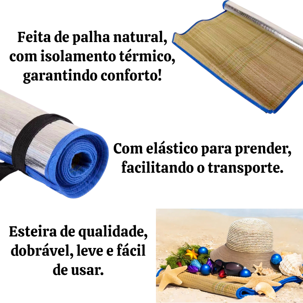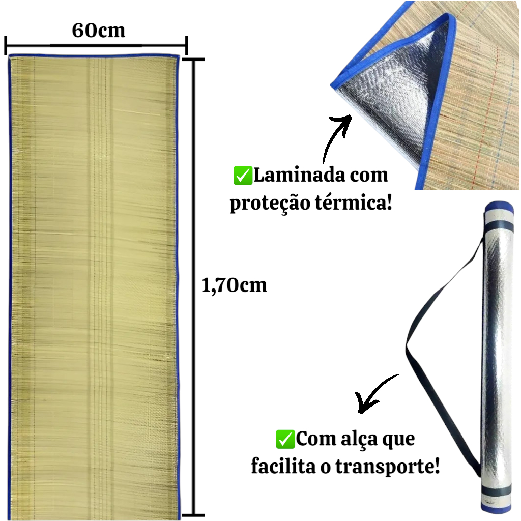 Esteira Praia Palha Natural Tapete Térmico 1,70cm Dobrável Com Alça Laminado Impermeável Parque